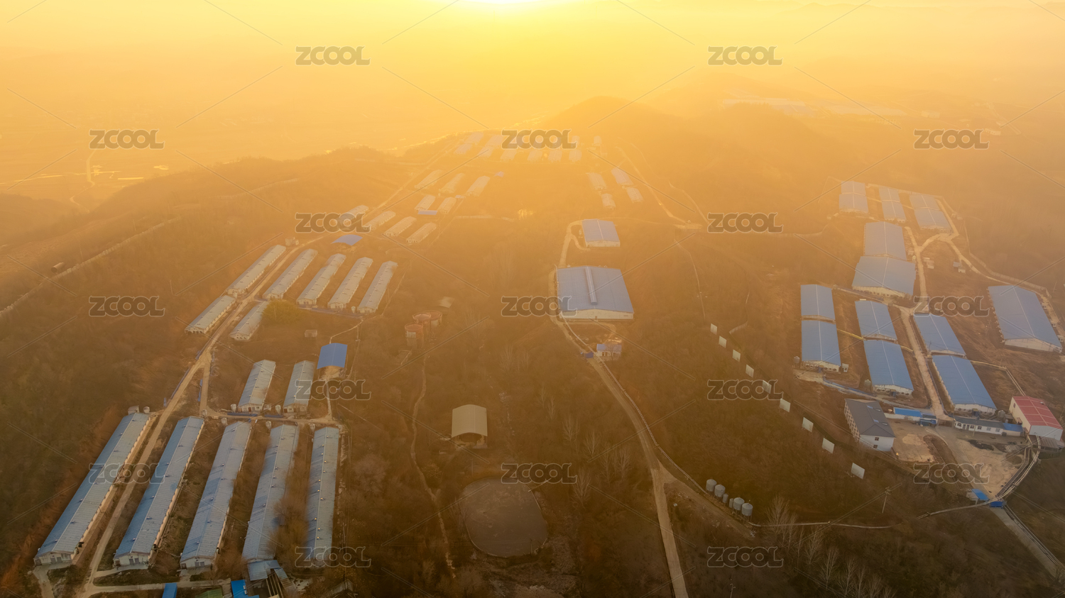 农村农业养殖场清晨日出航拍