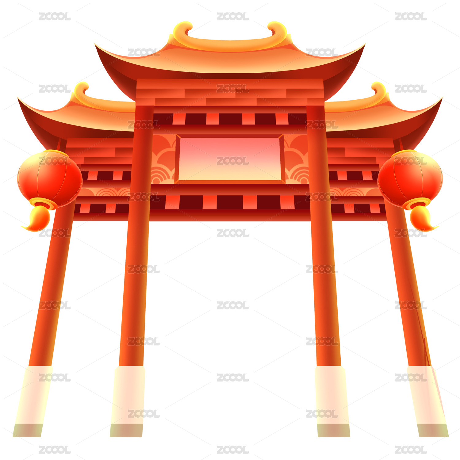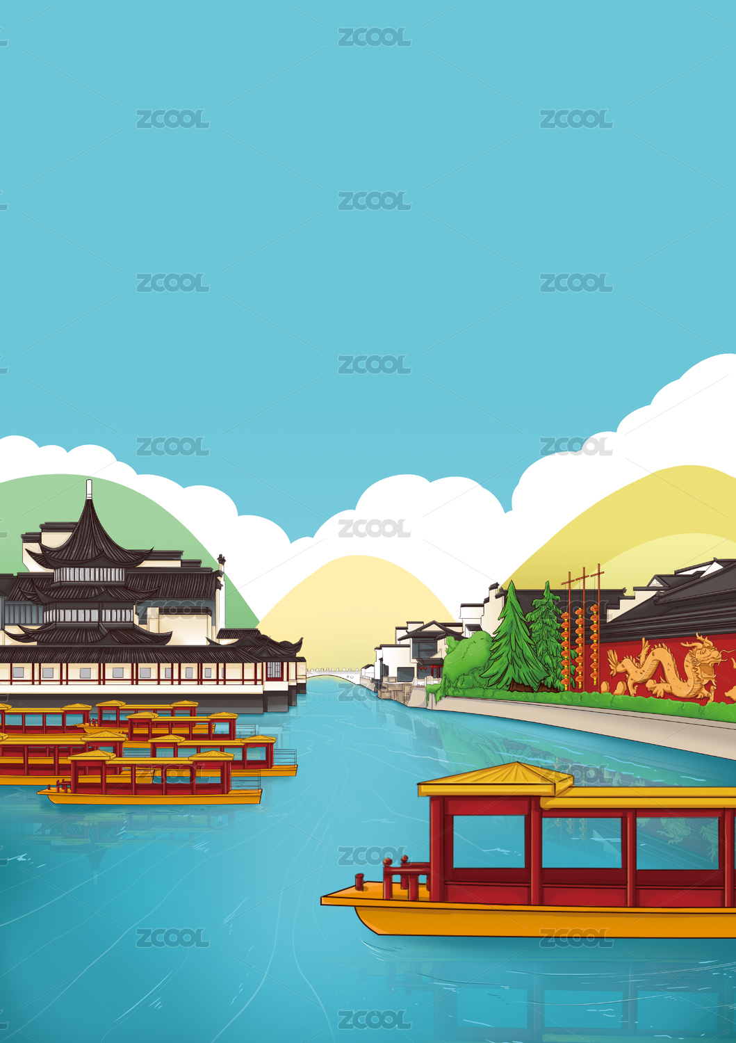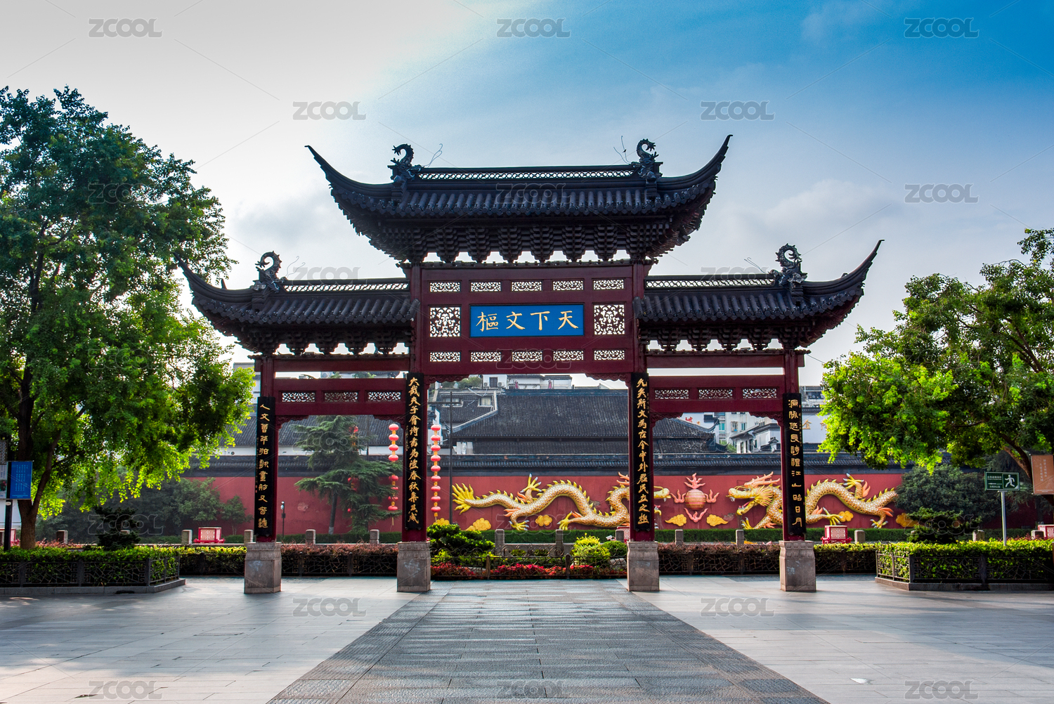 卡通手绘中国风夫子庙老街牌坊古建筑插画