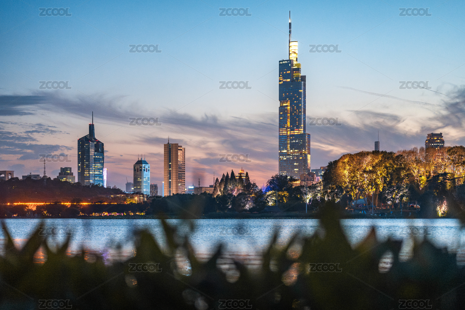 中国江苏南京玄武湖公园紫峰大厦夜景