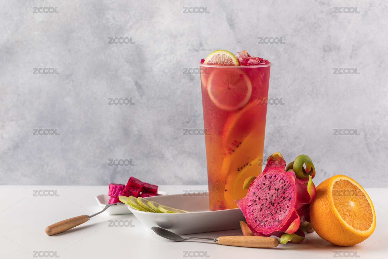 灰色背景上的火龙果橙汁饮品