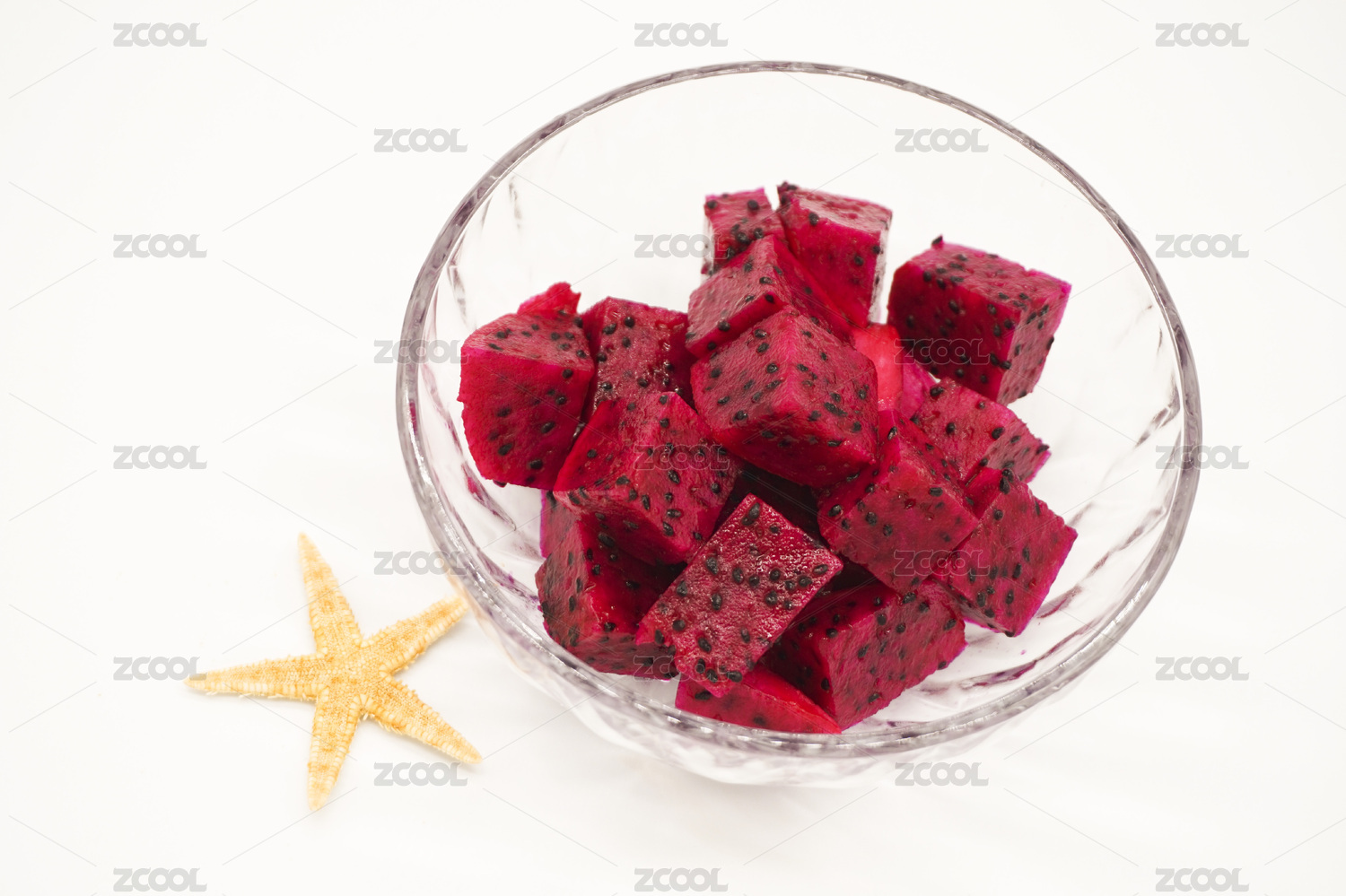 白色背景中放在水晶碗中的切好的火龙果