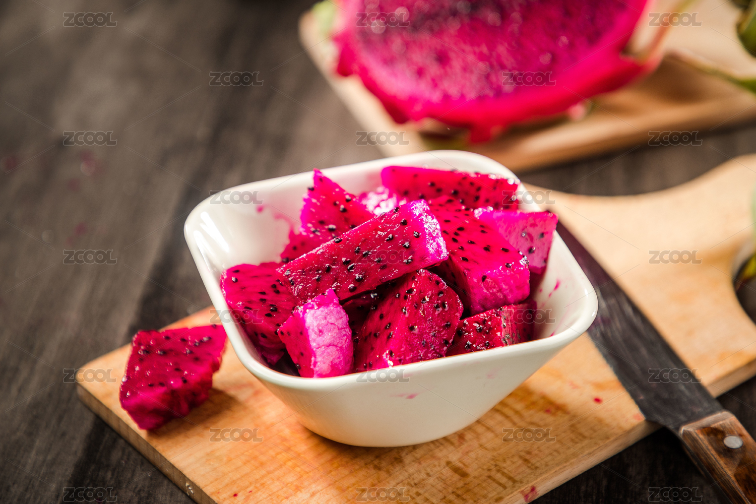 暗色木纹桌上放着一碗切成小块的红心火龙果