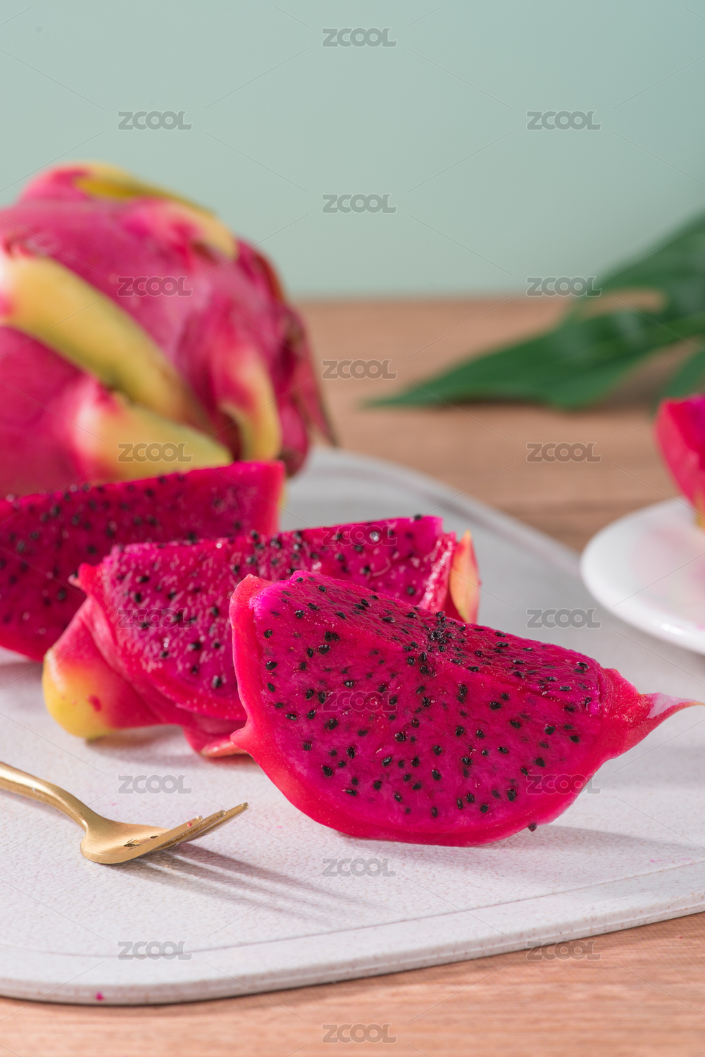 木头桌面上白色盘子里的火龙果果肉