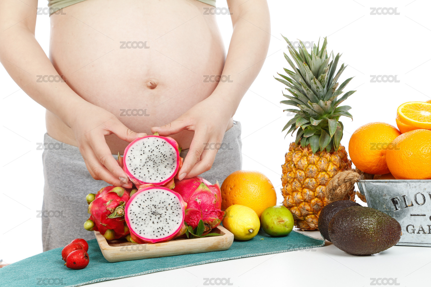 桌子后孕妇手上拿着半边白心火龙果