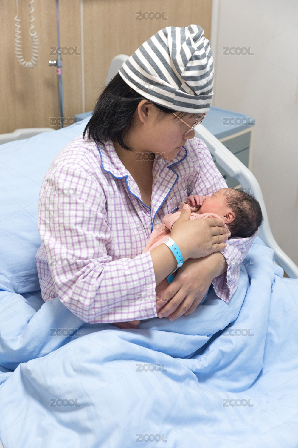 医院病房中一位母亲将新生儿抱在怀中