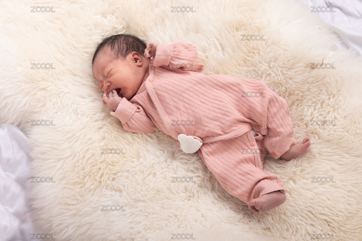 躺在羊毛毯上的新生儿咬着手睡觉