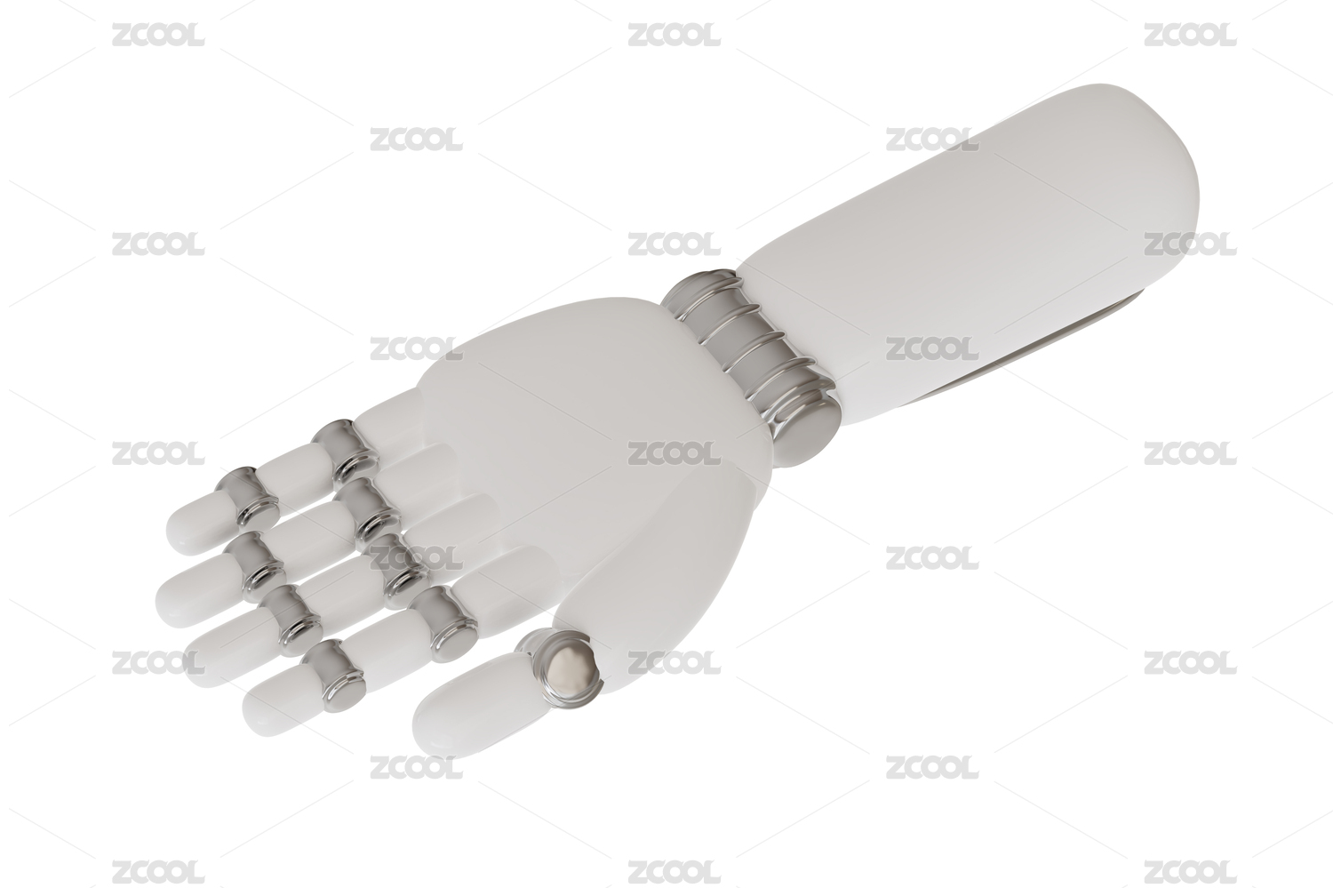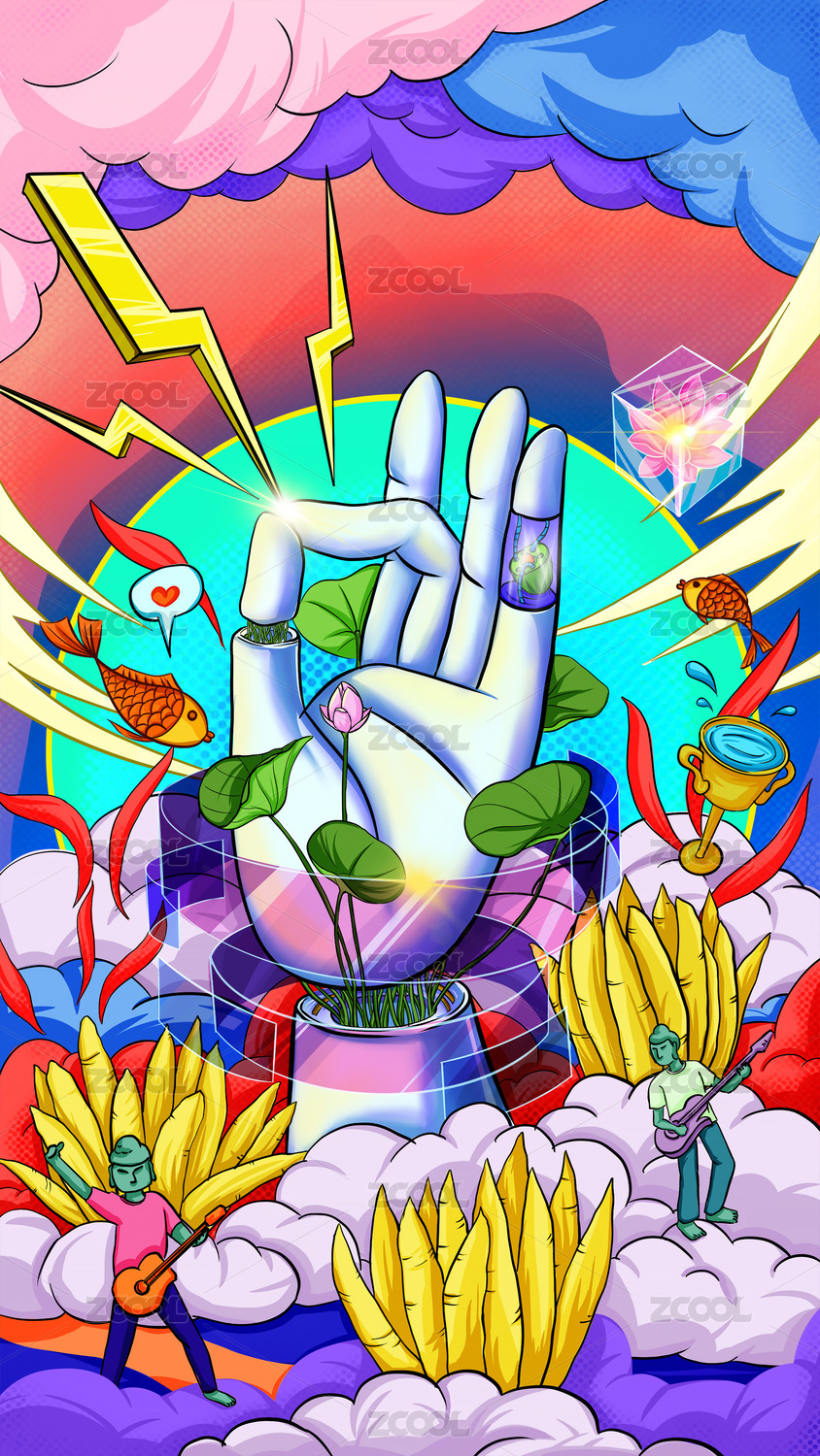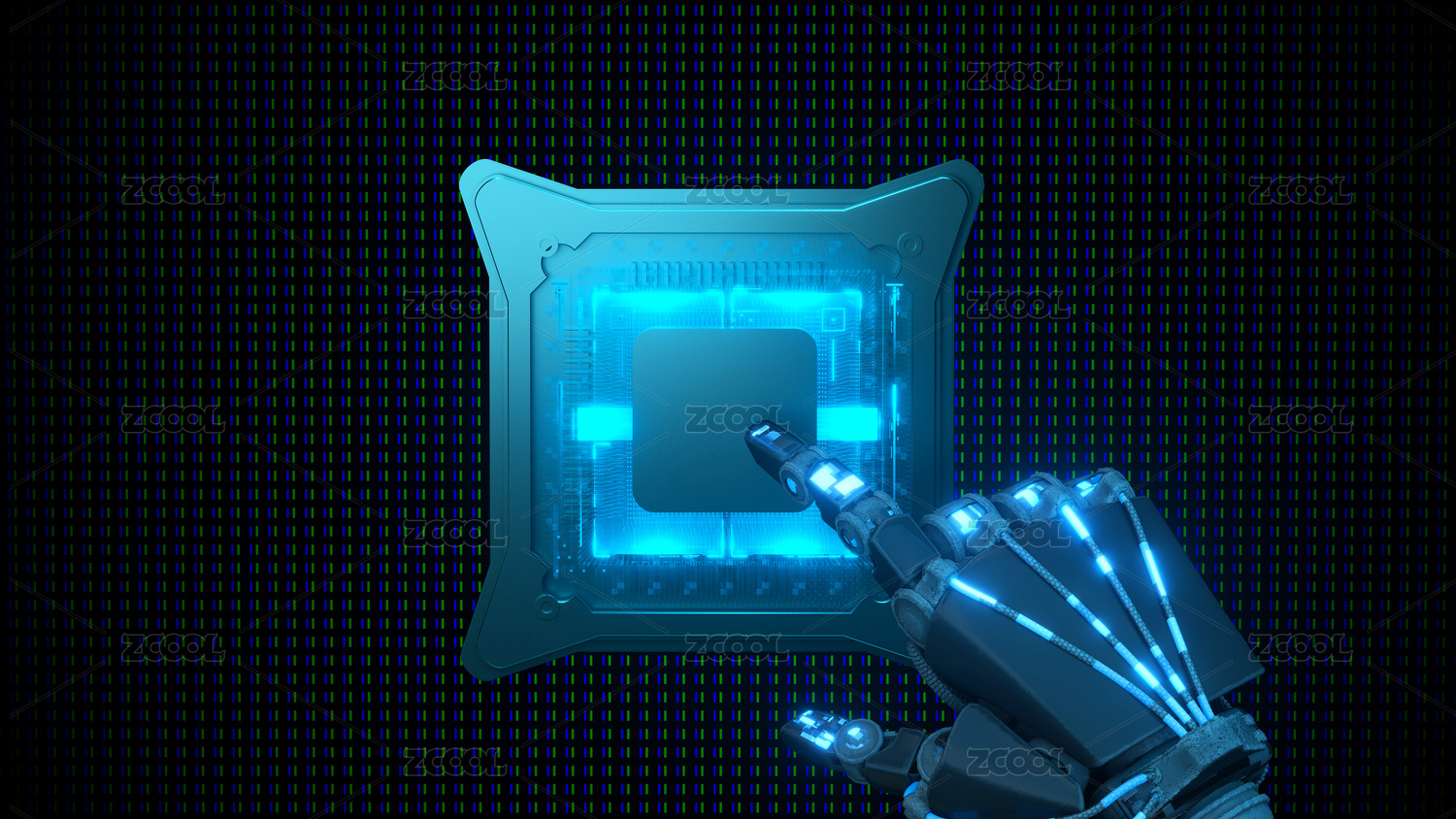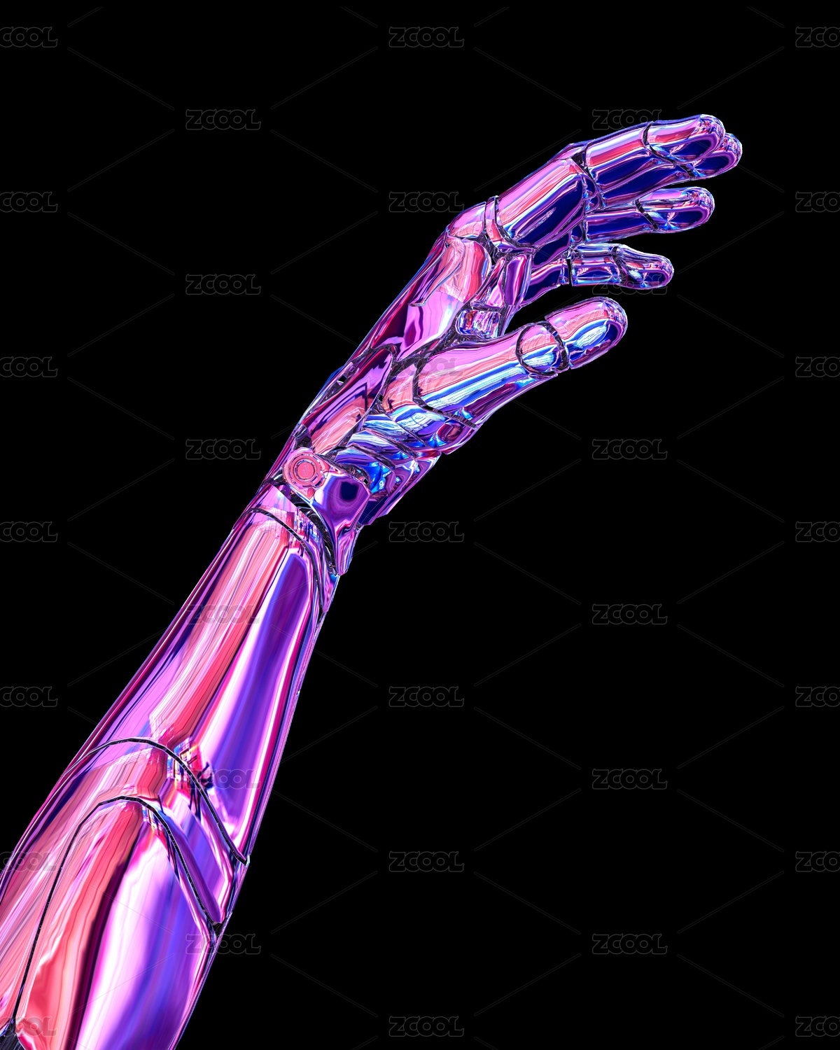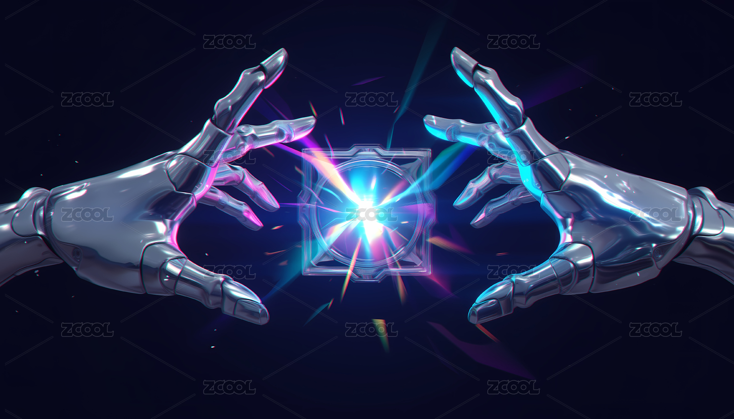 一双仿人机械手发光芯片全息色彩3D插画