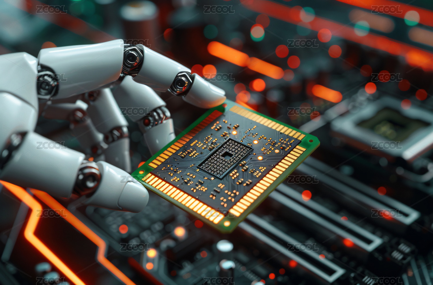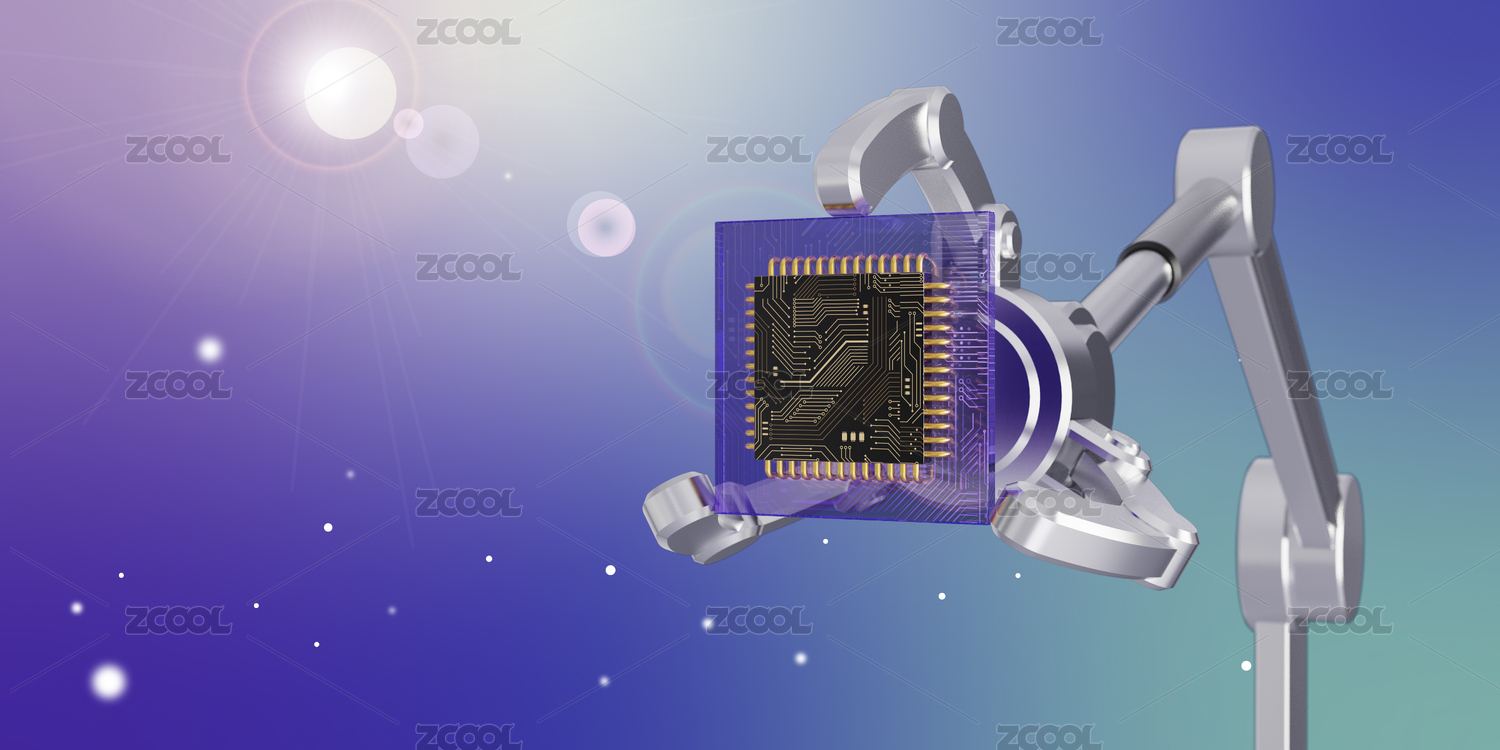 一个机械手臂拿着一个电脑cpu芯片