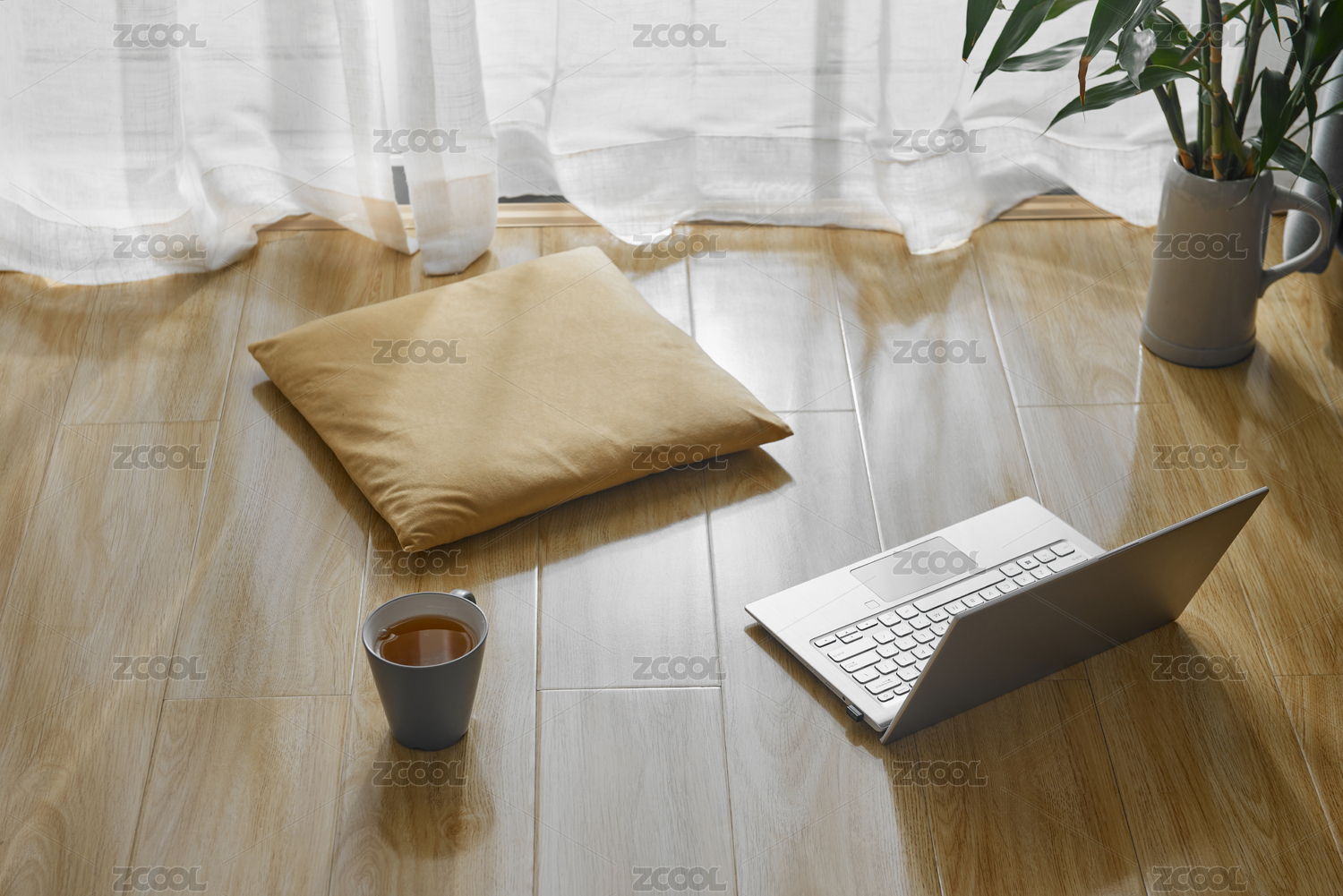 木地板上的笔记本电脑和坐垫以及茶水