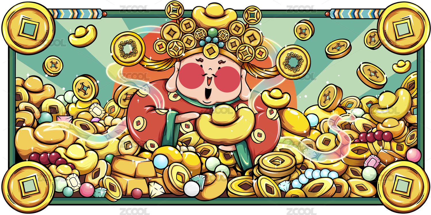 春节五福星财神元宝国潮插画