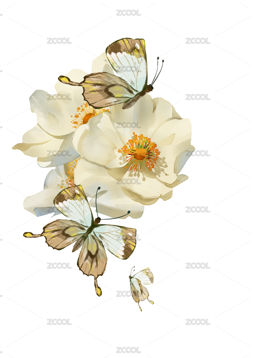蝴蝶与月季花黄色白色服装印花清新