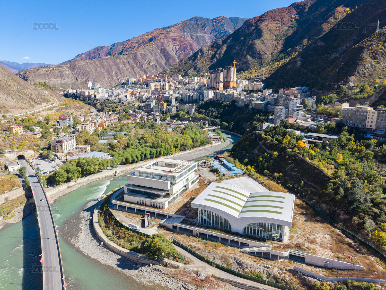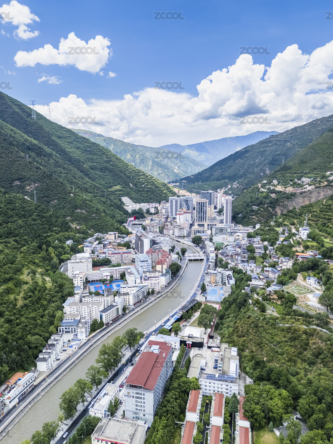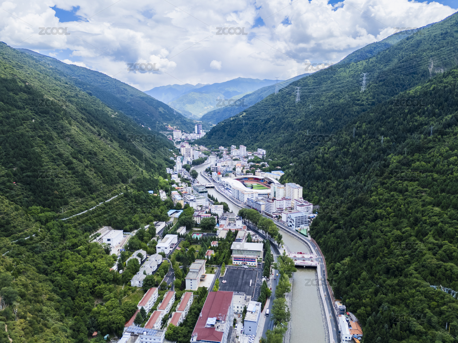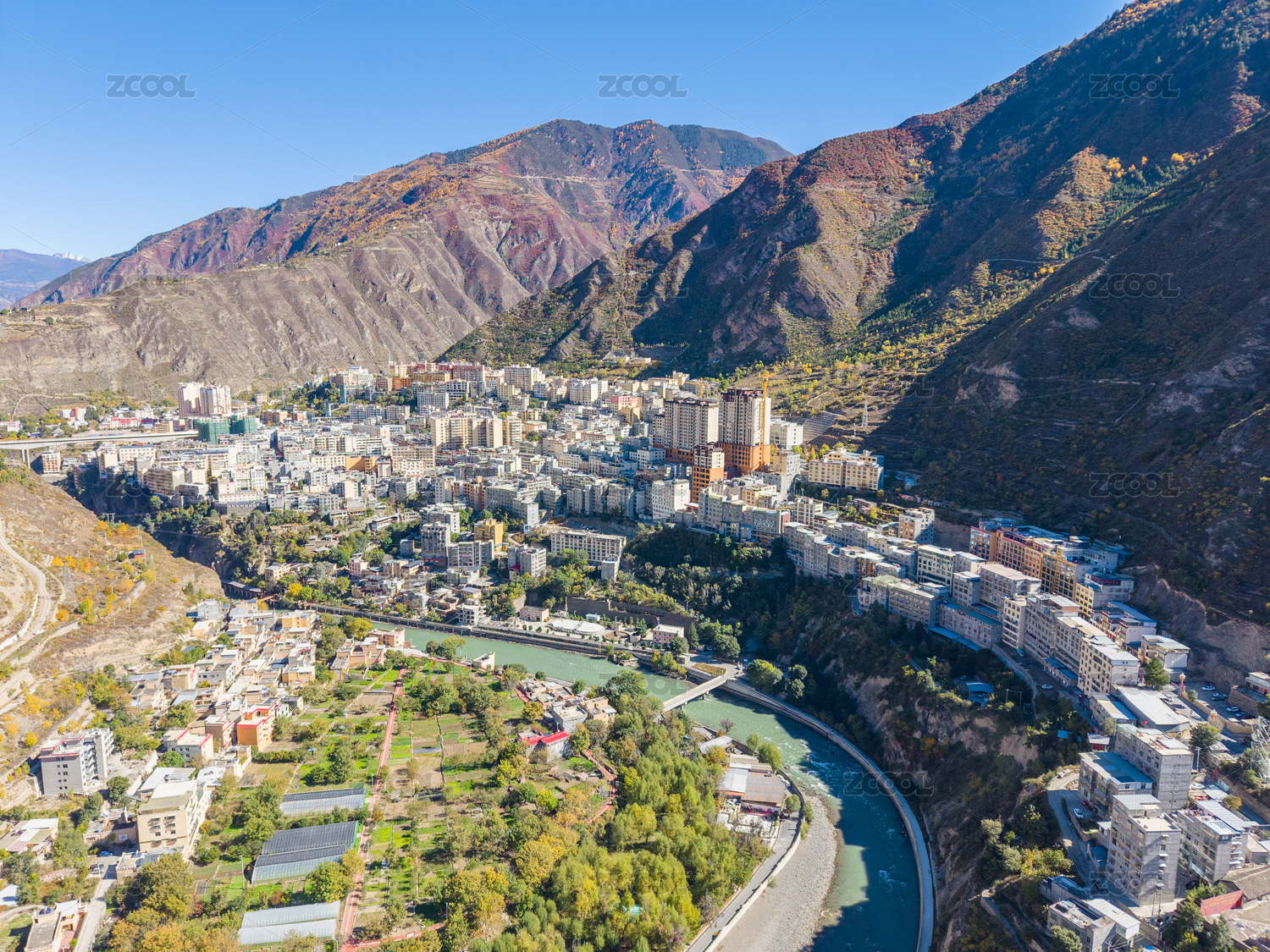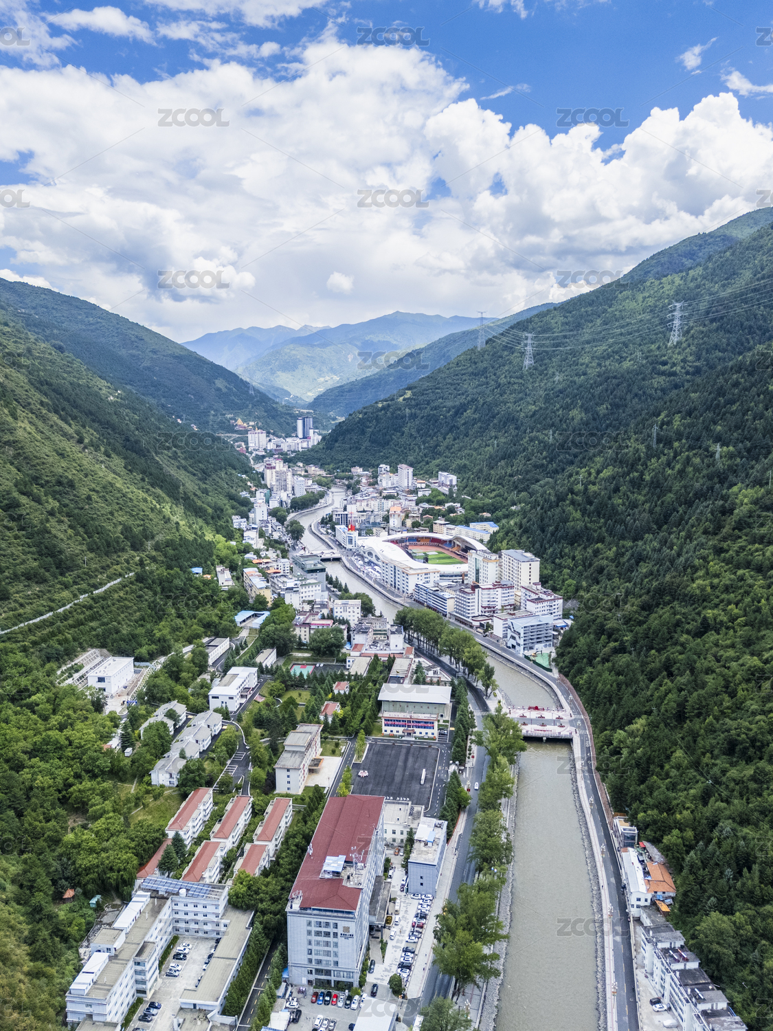 中国四川省阿坝州茂县叠溪镇沙湾村岷江俯拍