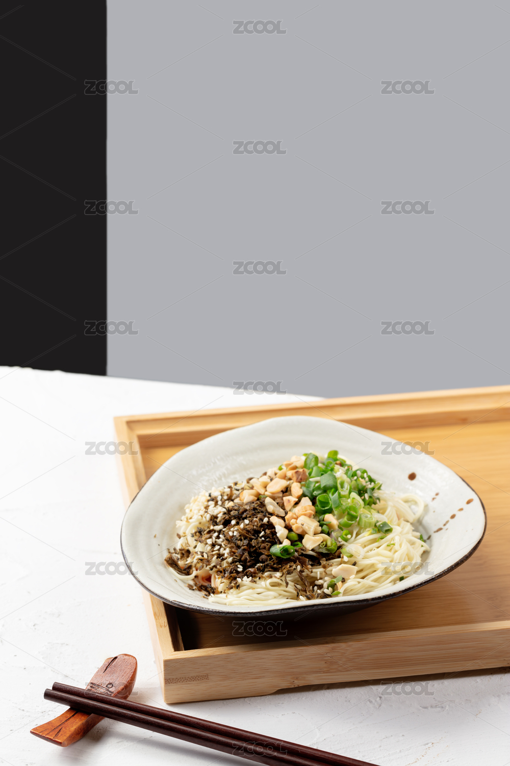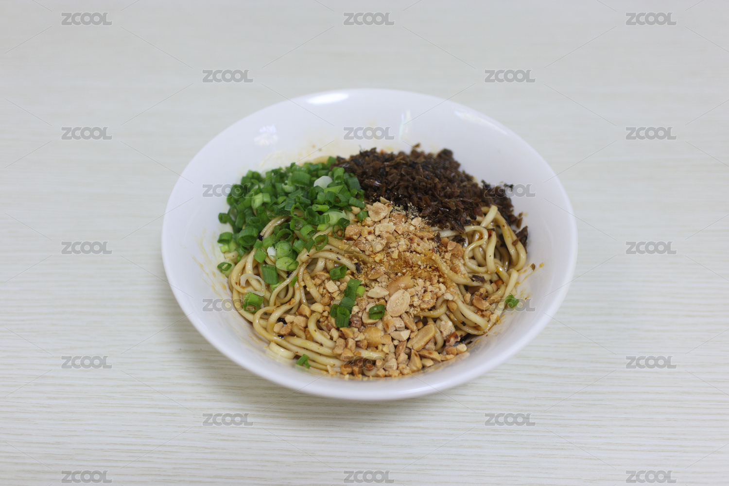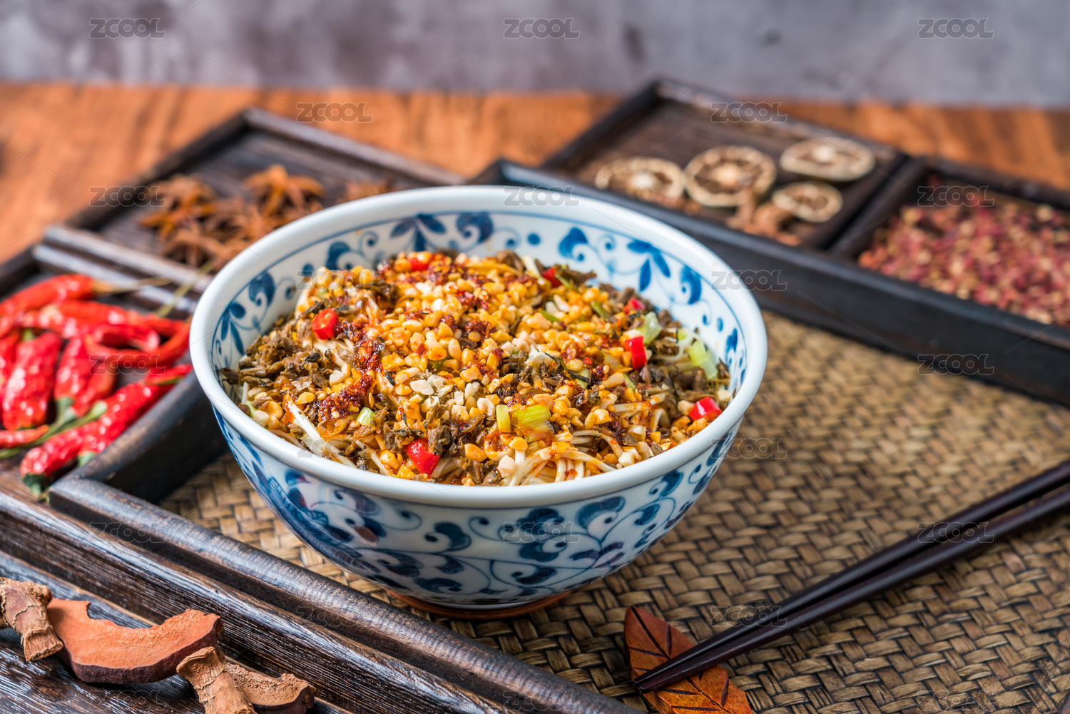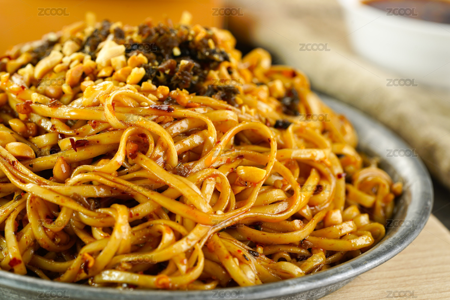 大碗里的筷子夹着的韭菜麻辣干拌面燃面