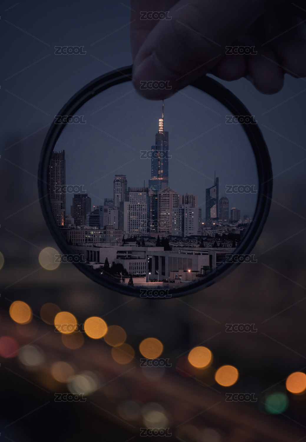 现代摩天大楼在商业区在傍晚的光线的底视图在日落镜头光晕滤镜效果