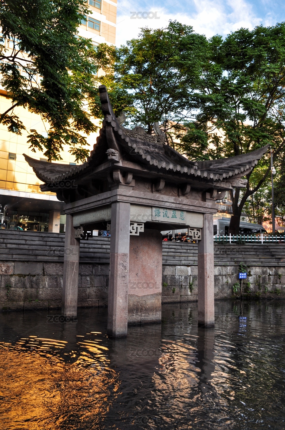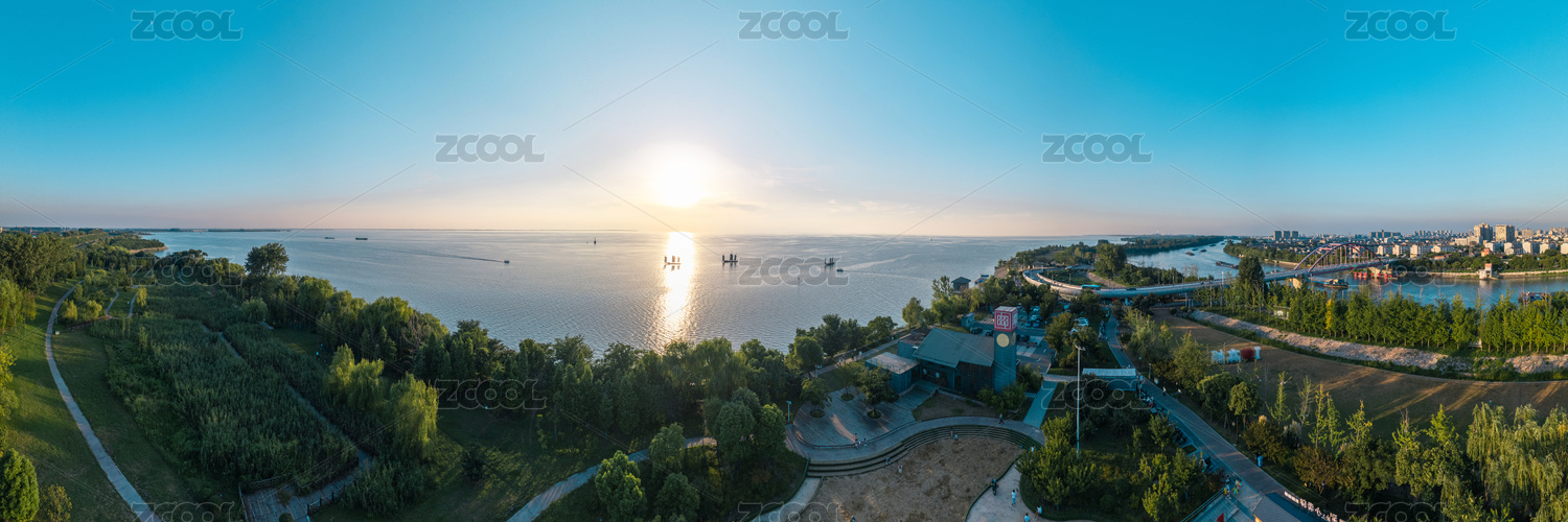 春天的大运河岸边盛开的梅花白色栏杆和路灯