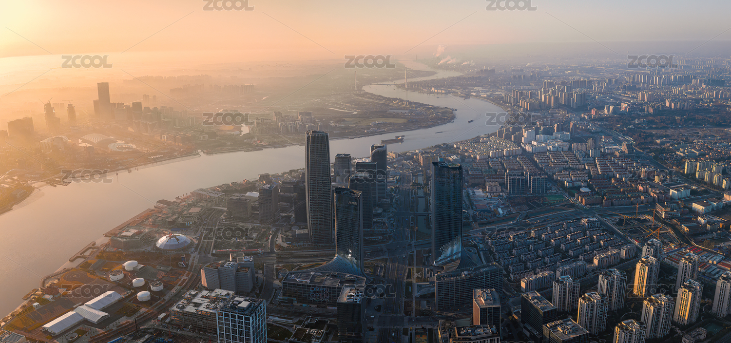 上海徐汇滨江西岸城市建筑群航拍日出