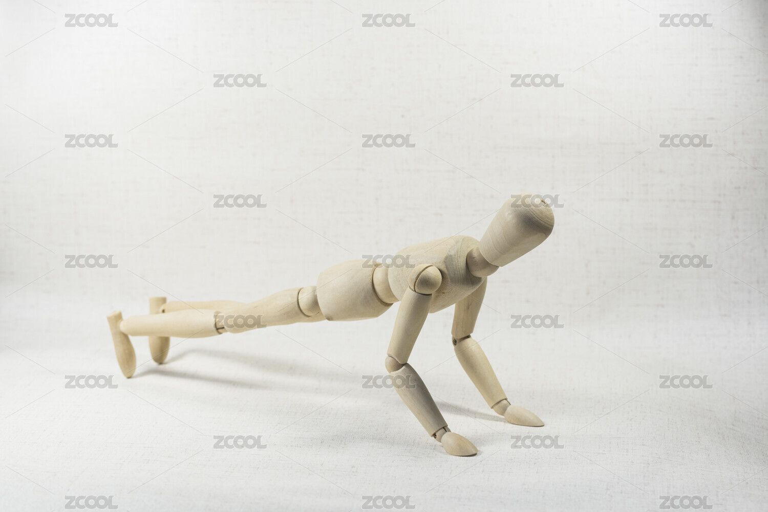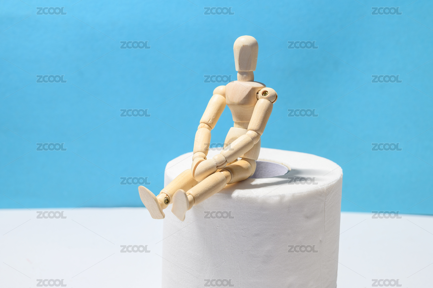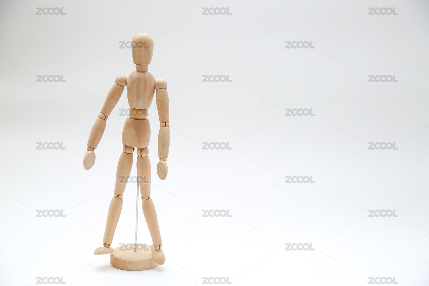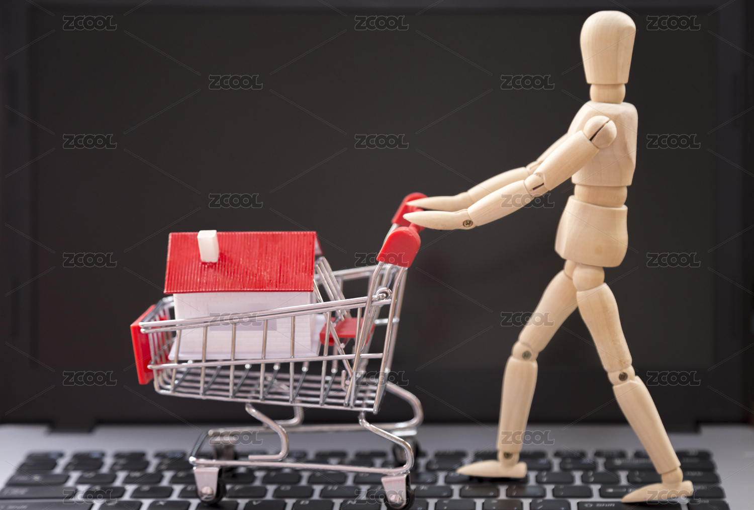 笔记本电脑与推着装有房子模型的购物车的木偶模型静物特写