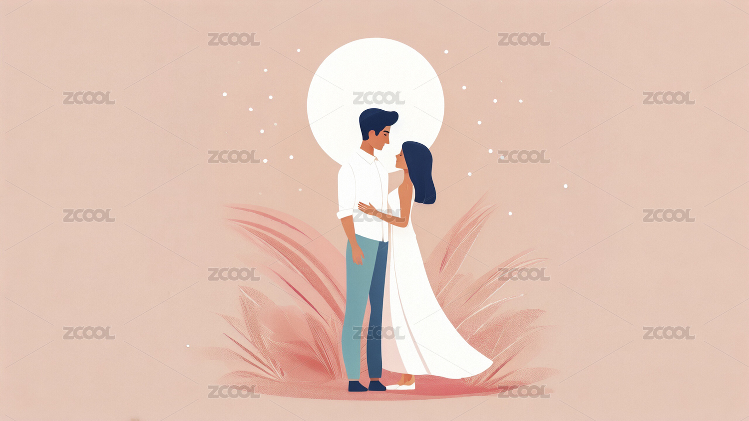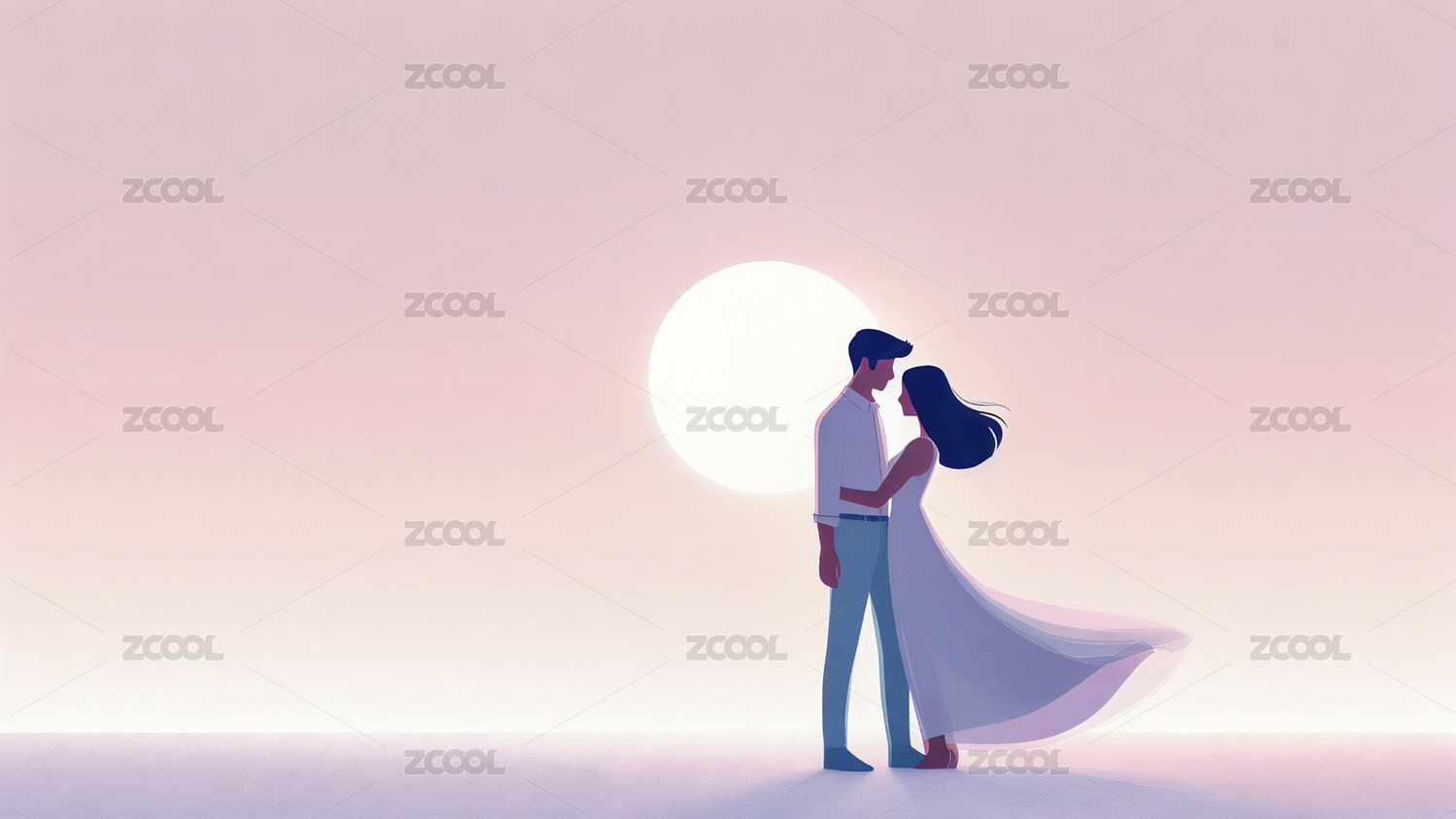 年轻情侣拥抱插画洁白的月亮悬挂空中背景
