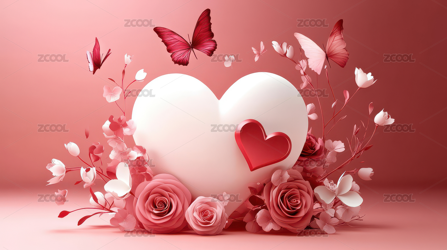 粉色背景下的爱心玫瑰和蝴蝶情人节背景