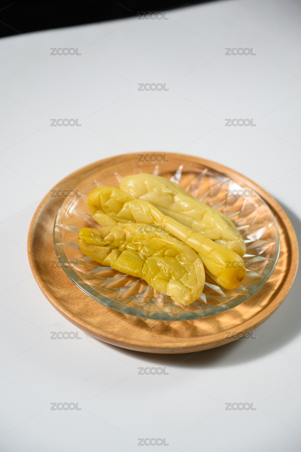 桌面上的盘子里的美味可口的酸黄瓜皮