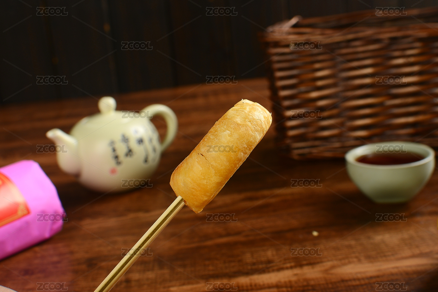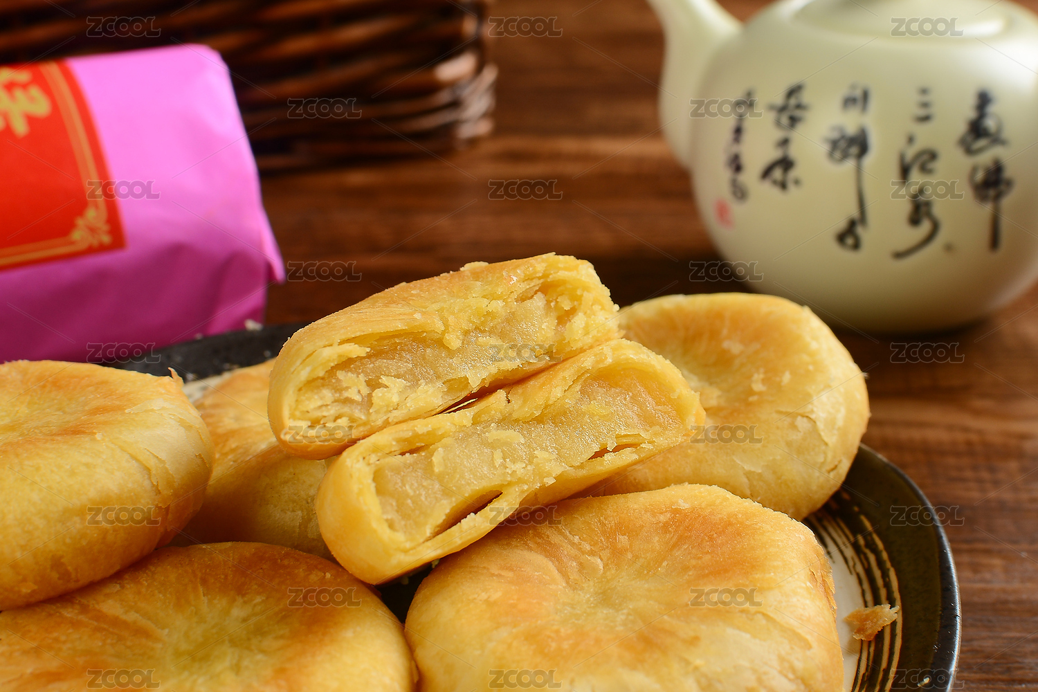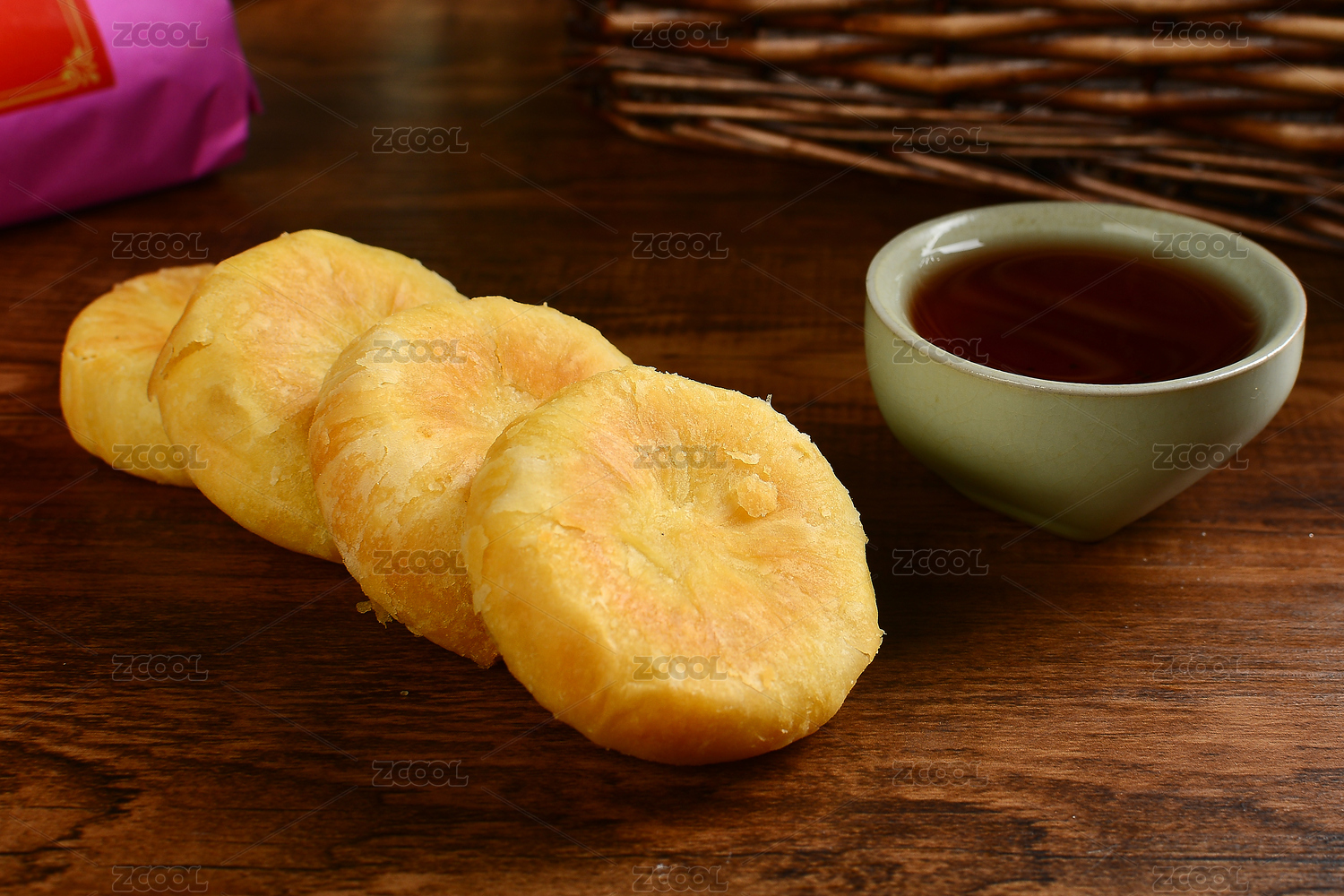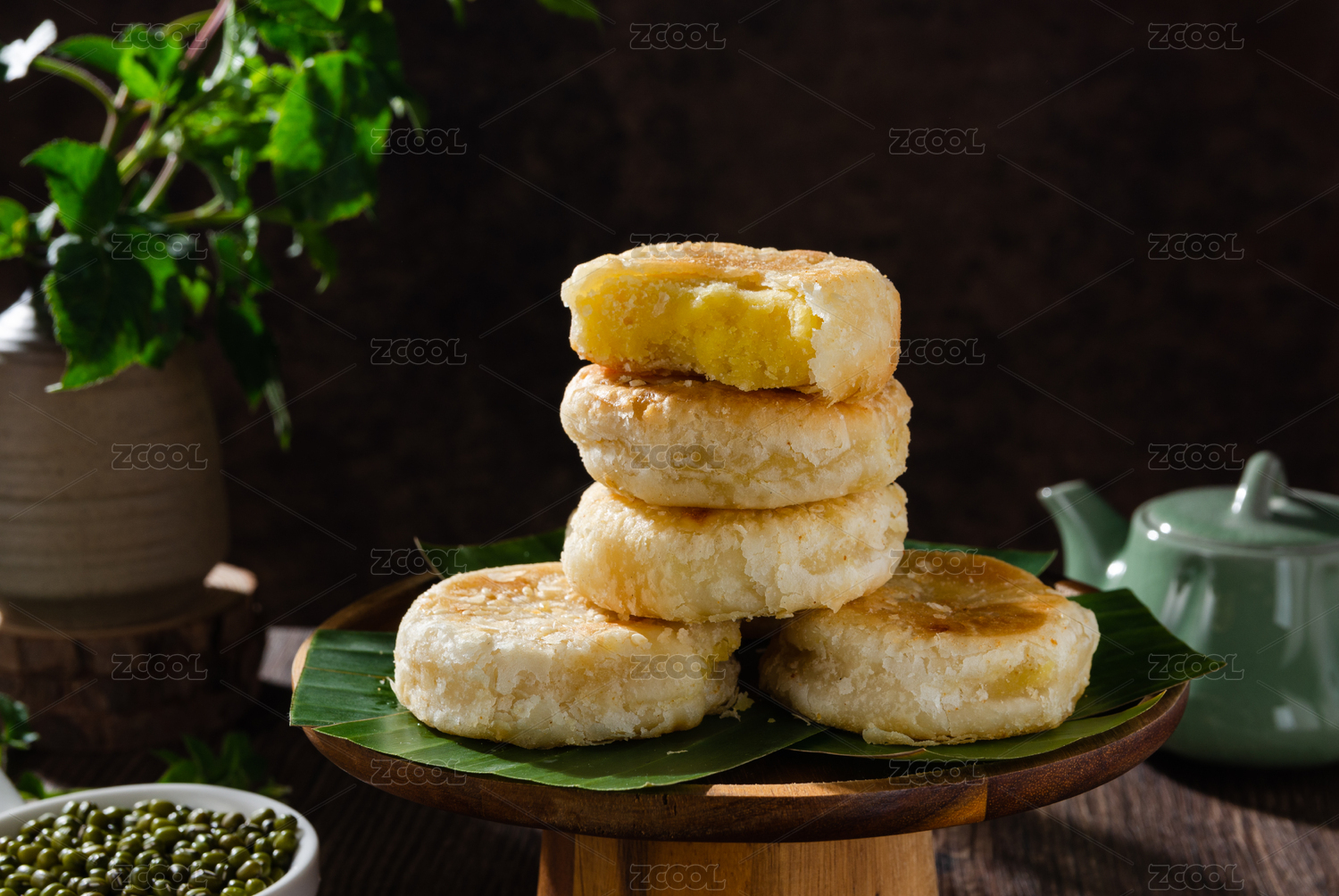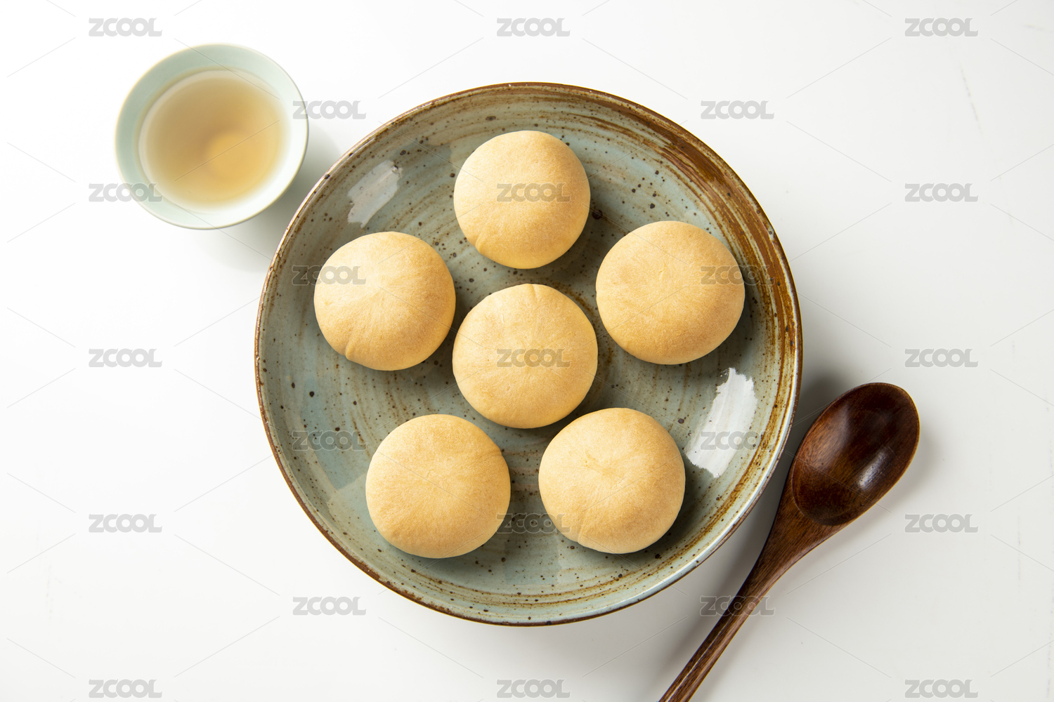 绿豆饼和茶放在木桌上