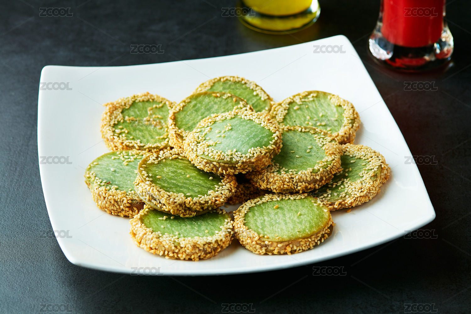 一盘绿豆饼摆放在桌面上特写