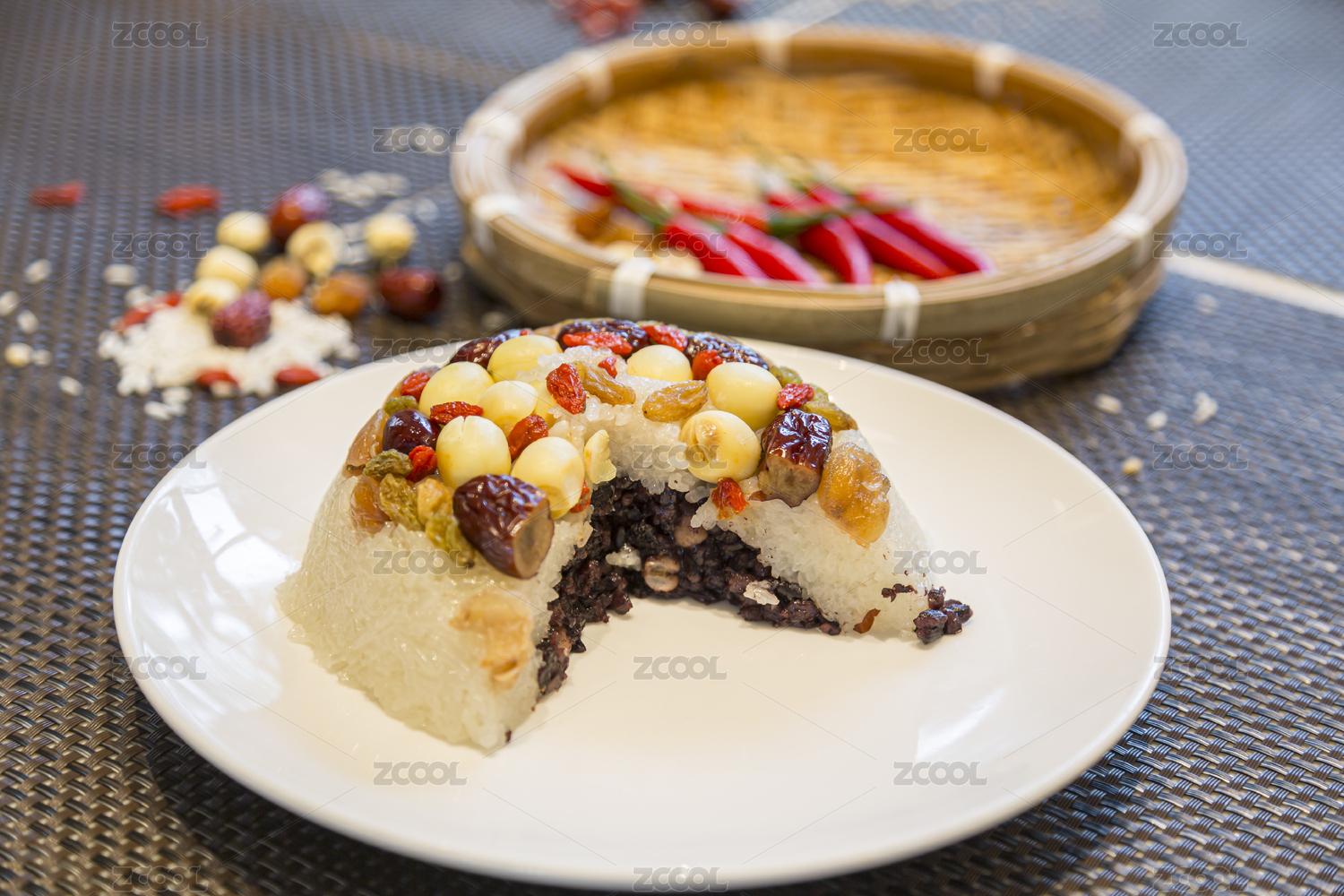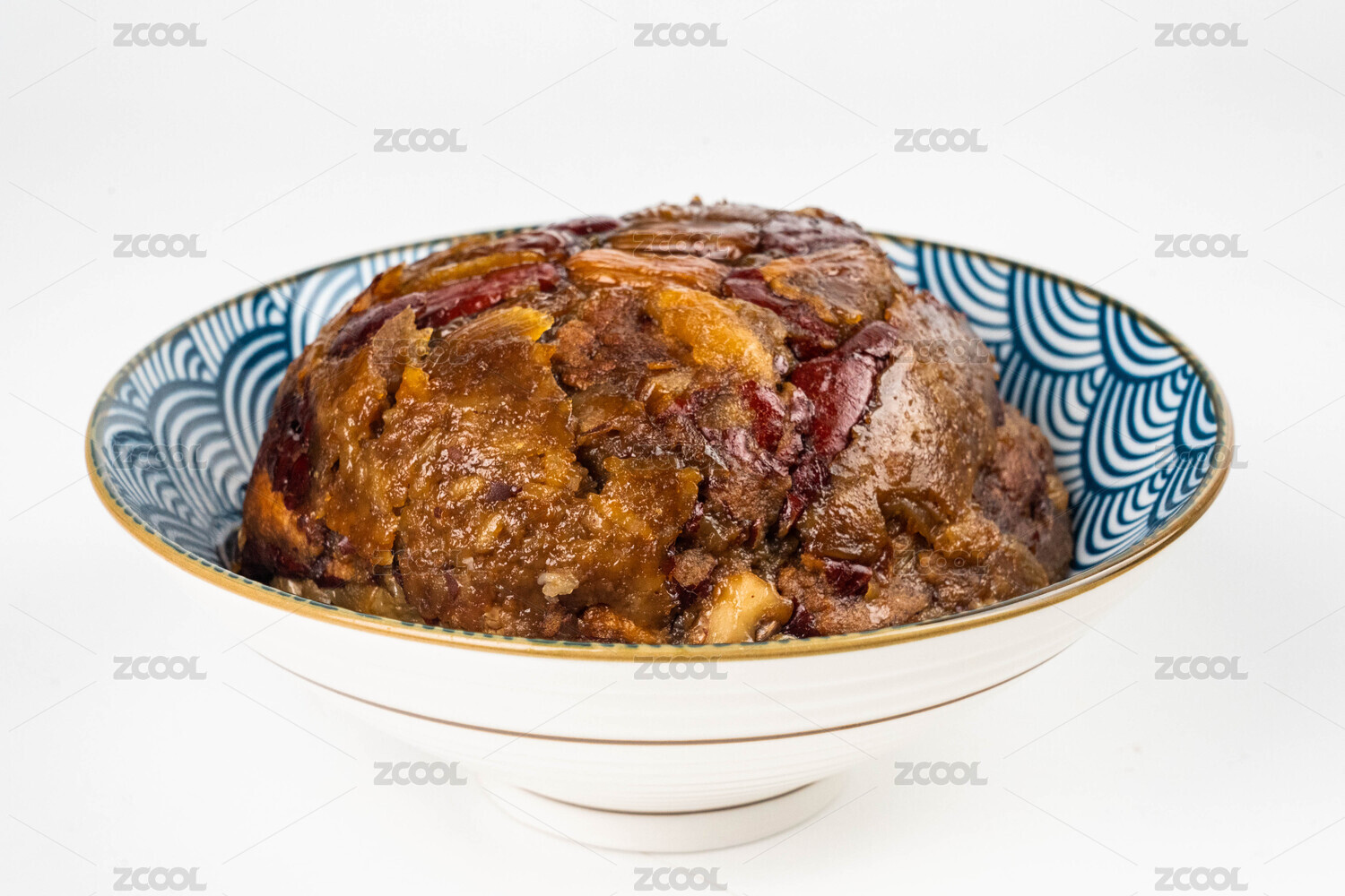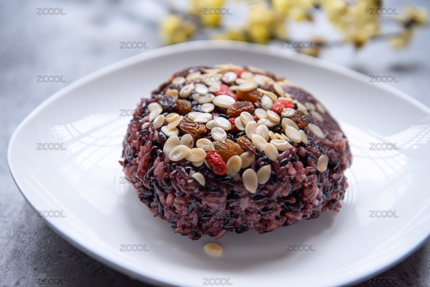 黑色背景上放在中式瓷盘里的黑糯米八宝饭