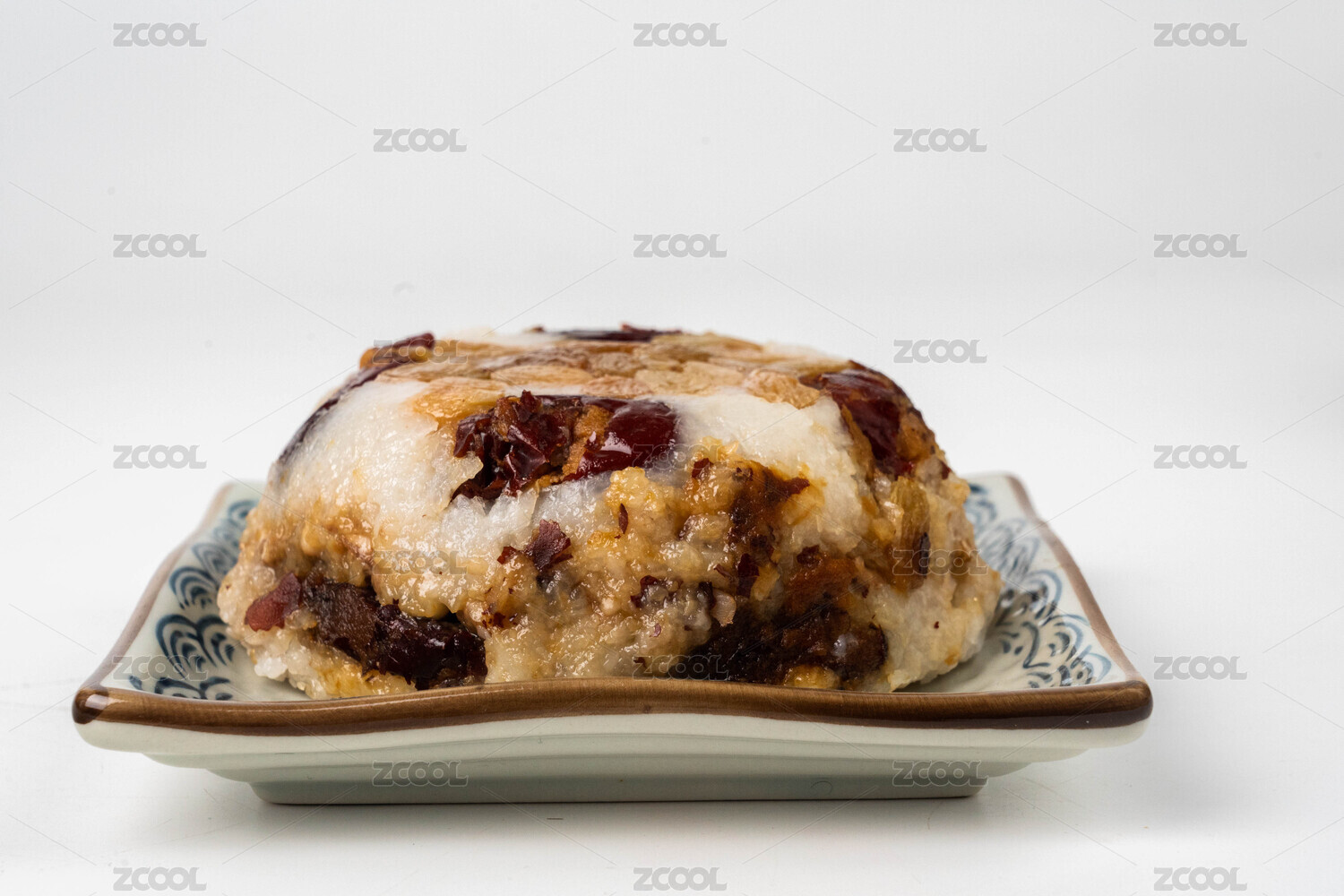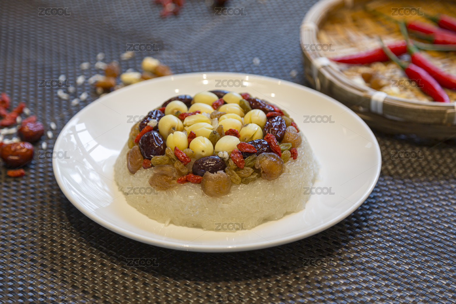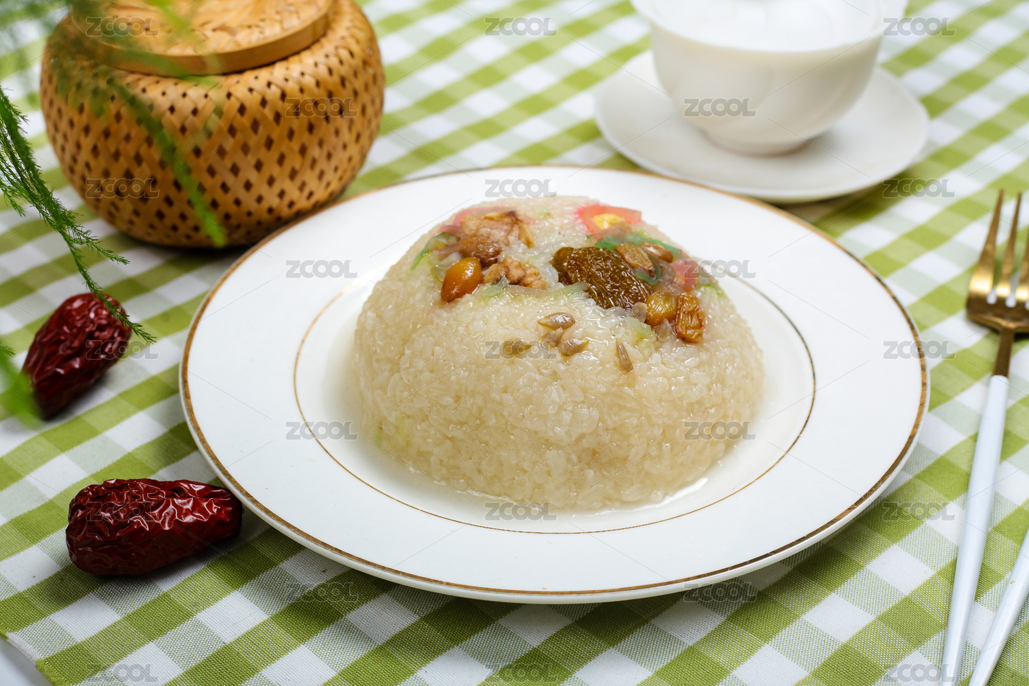 黑色背景上放在中式瓷盘里的黑糯米八宝饭