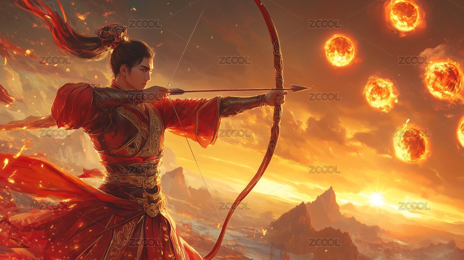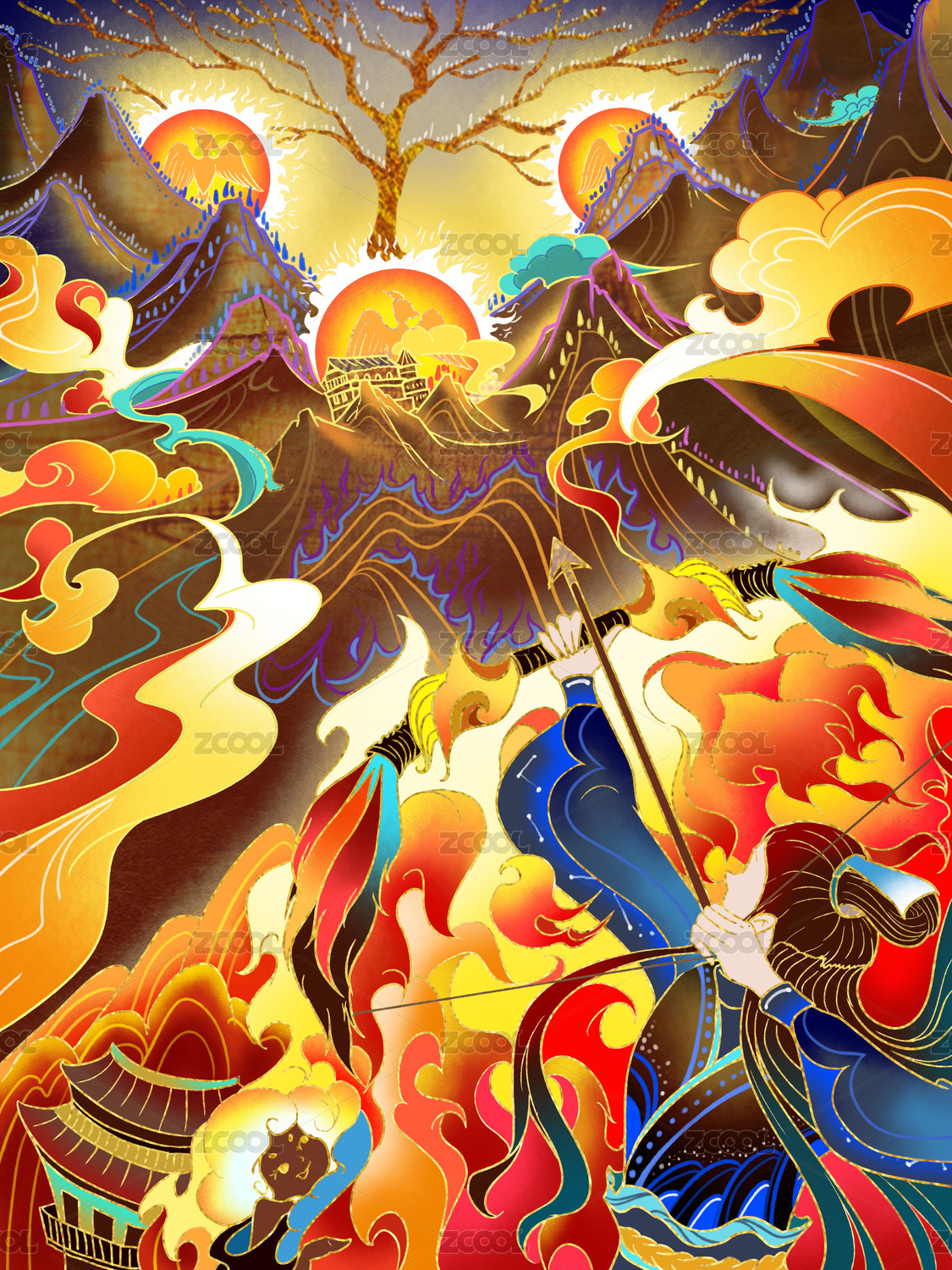 国风国潮中国神话故事后裔射日插画