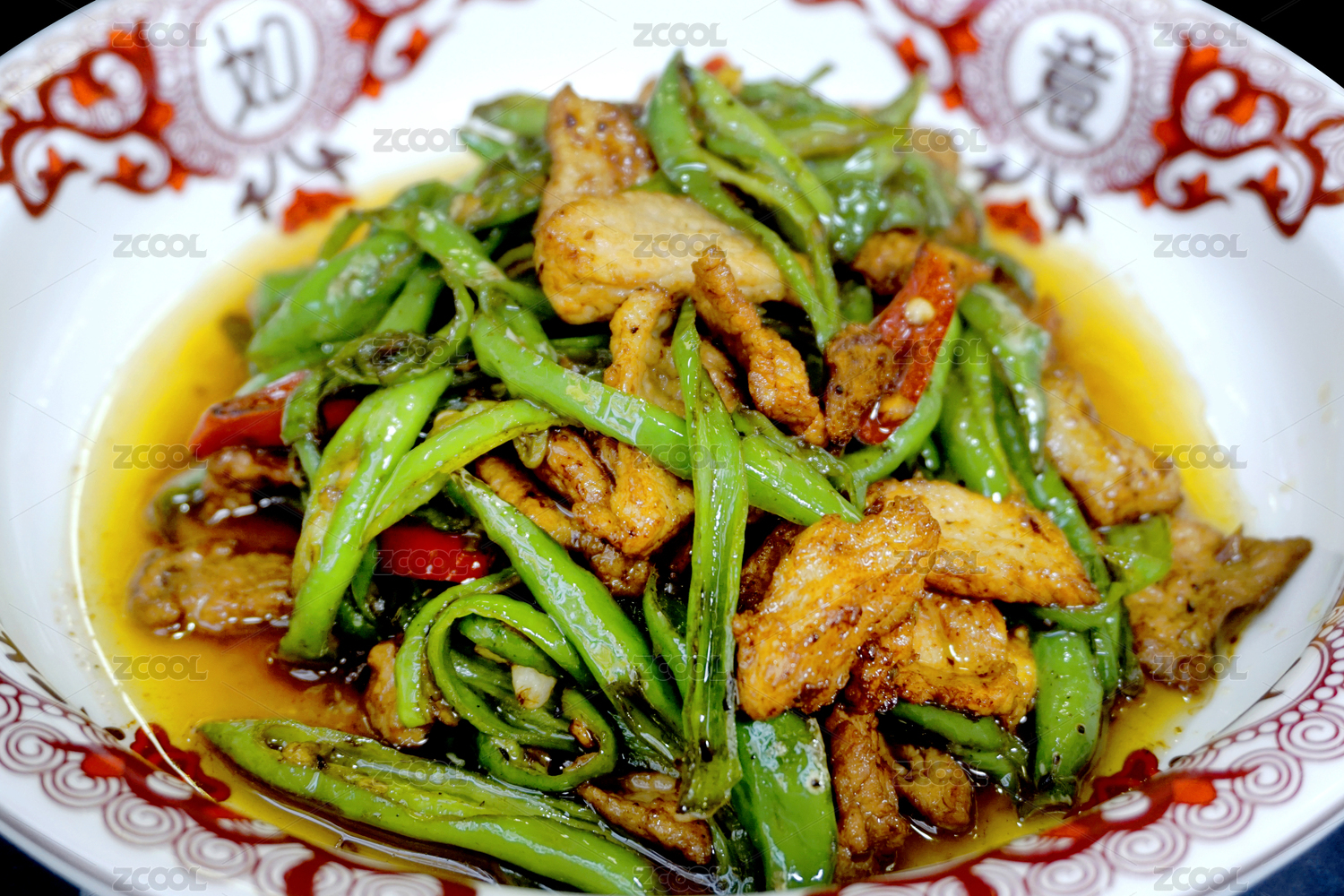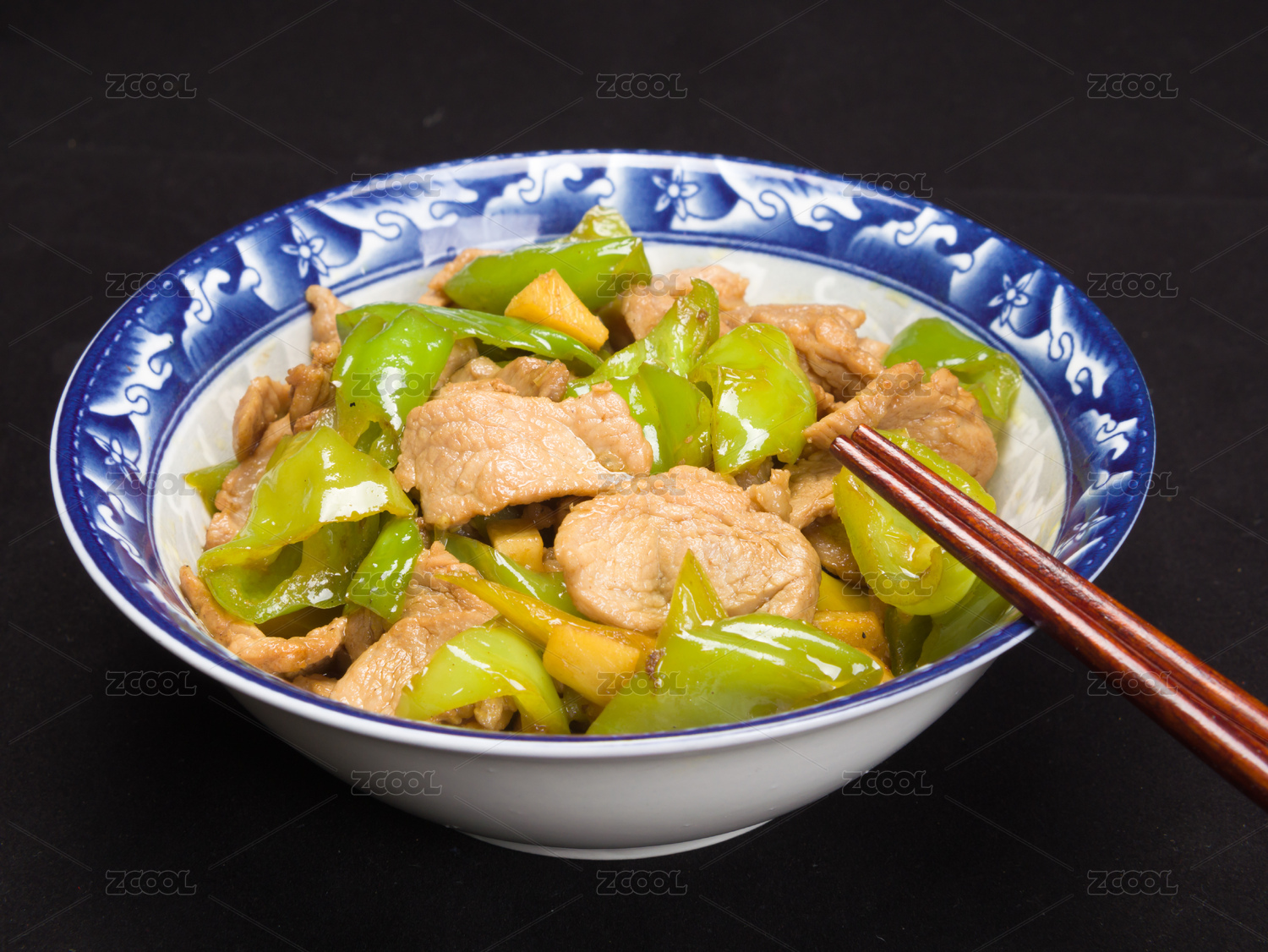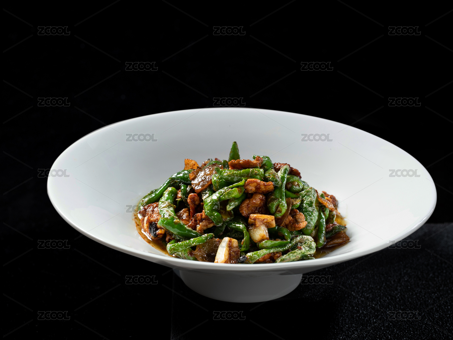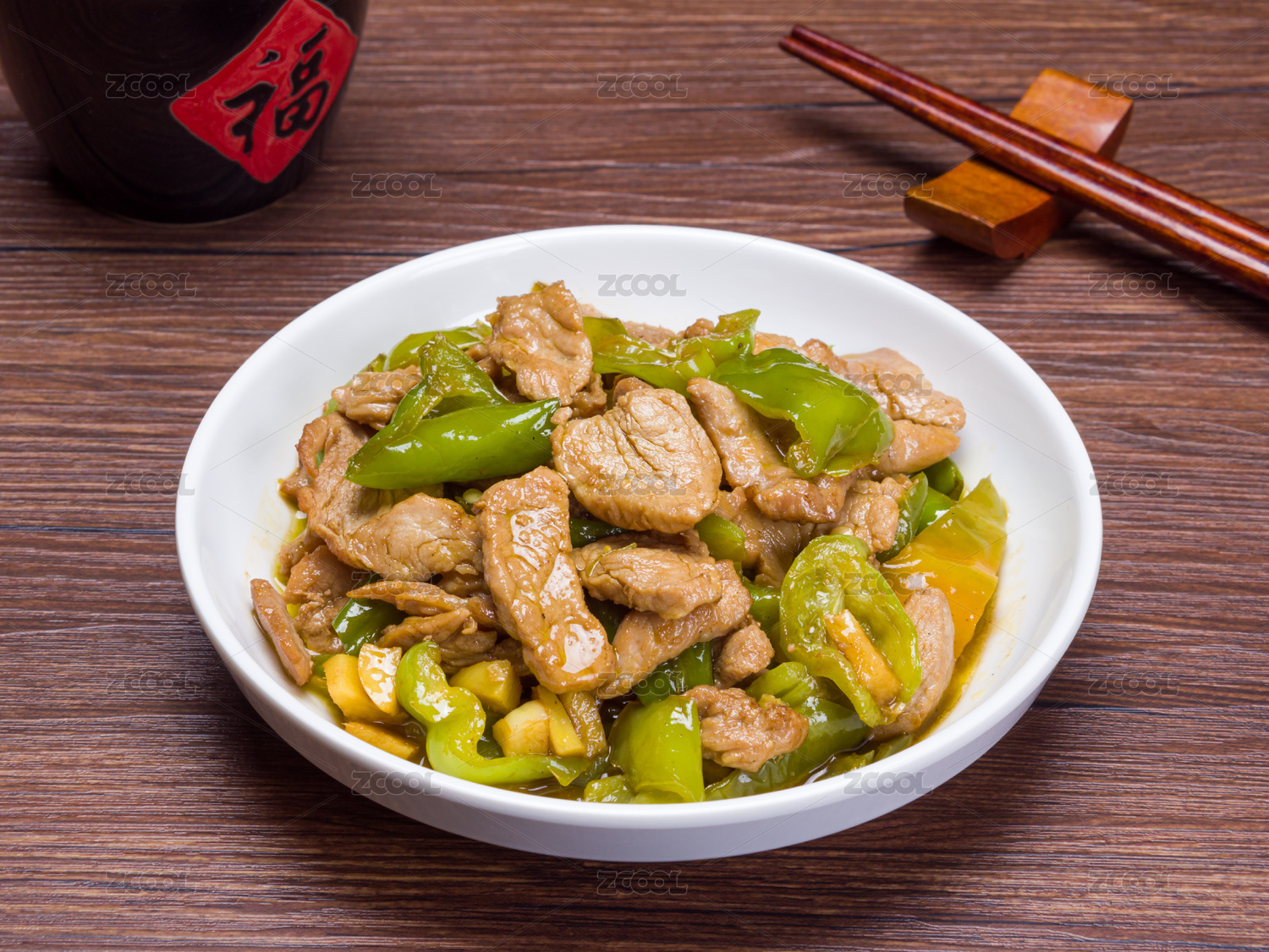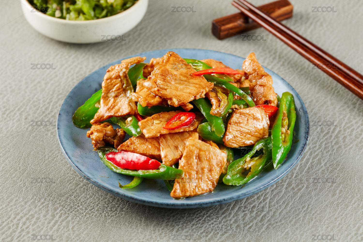 放在盘子里的湖南小炒肉青椒炒肉侧拍