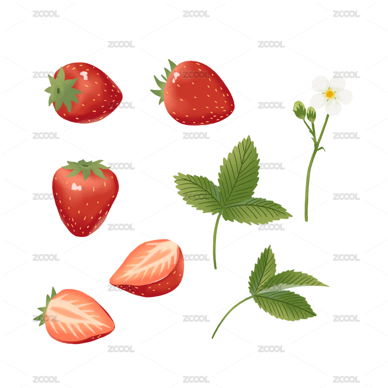 手绘风格草莓叶片花朵
