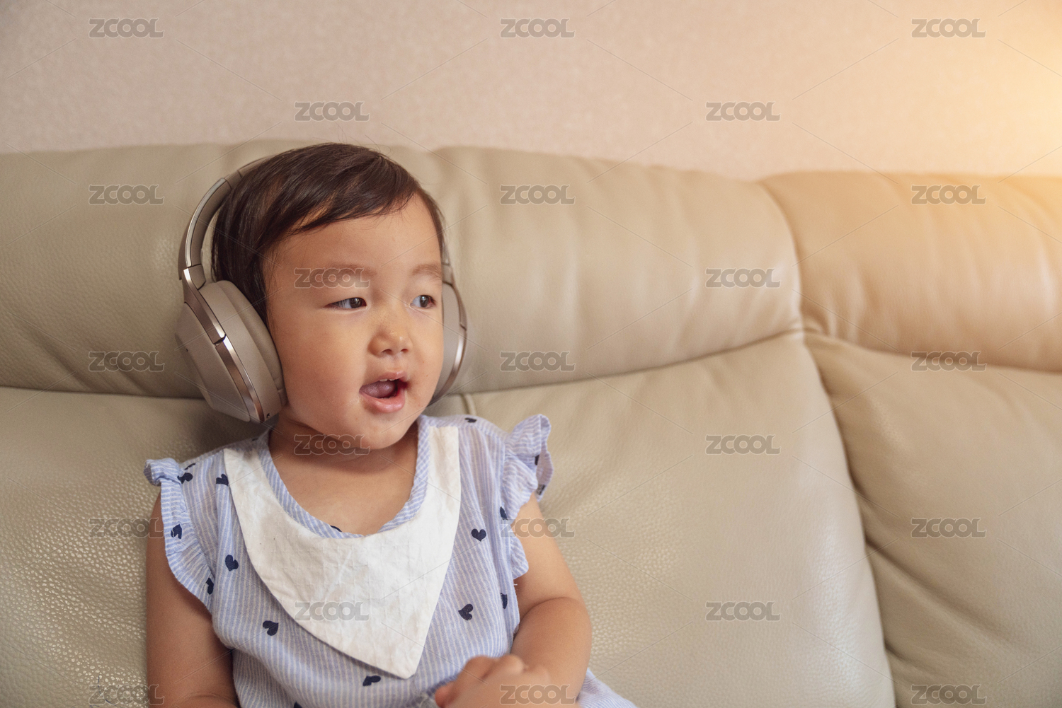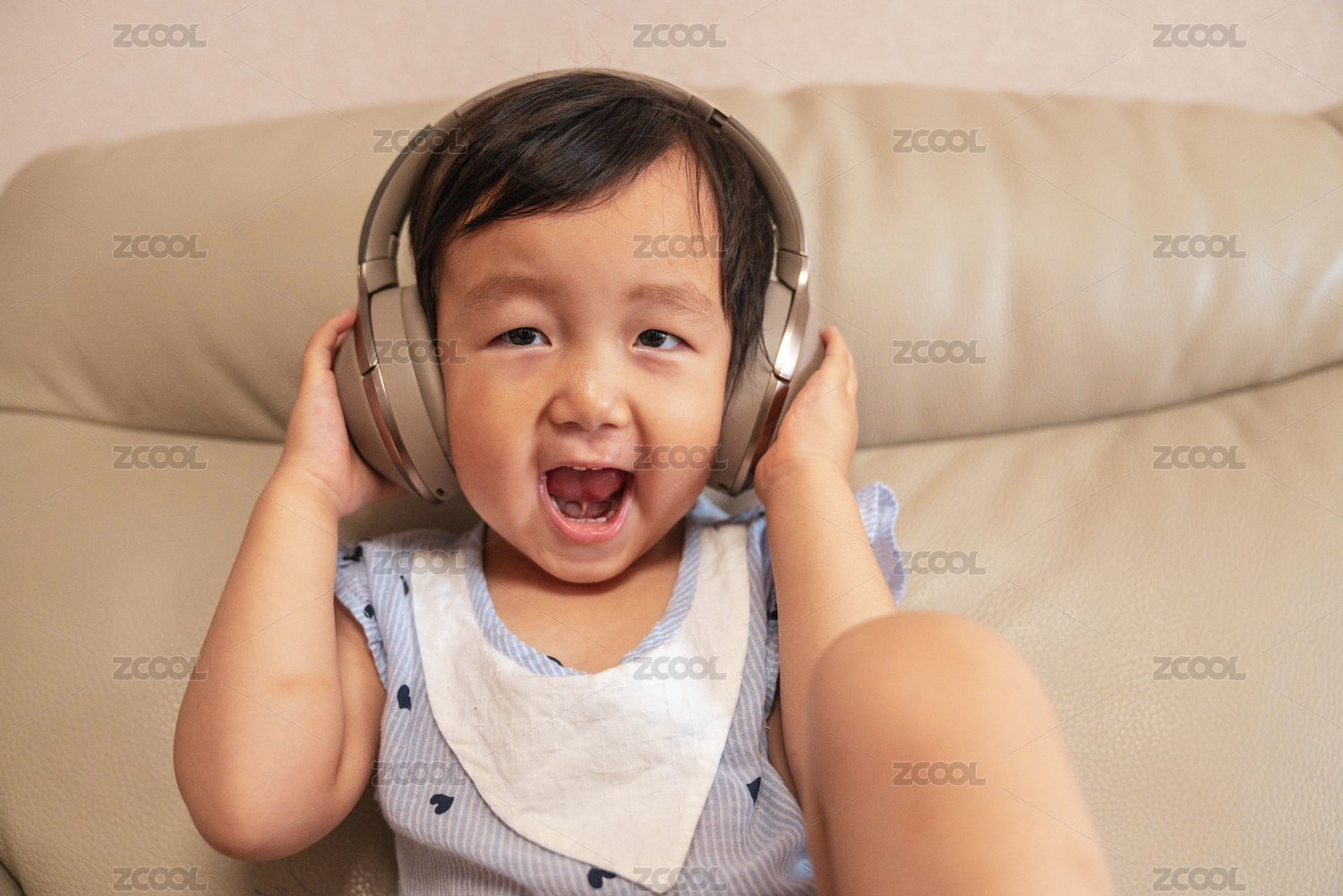 中国宝宝坐在沙发上,戴着耳机耳麦听音乐、长大嘴巴学唱歌