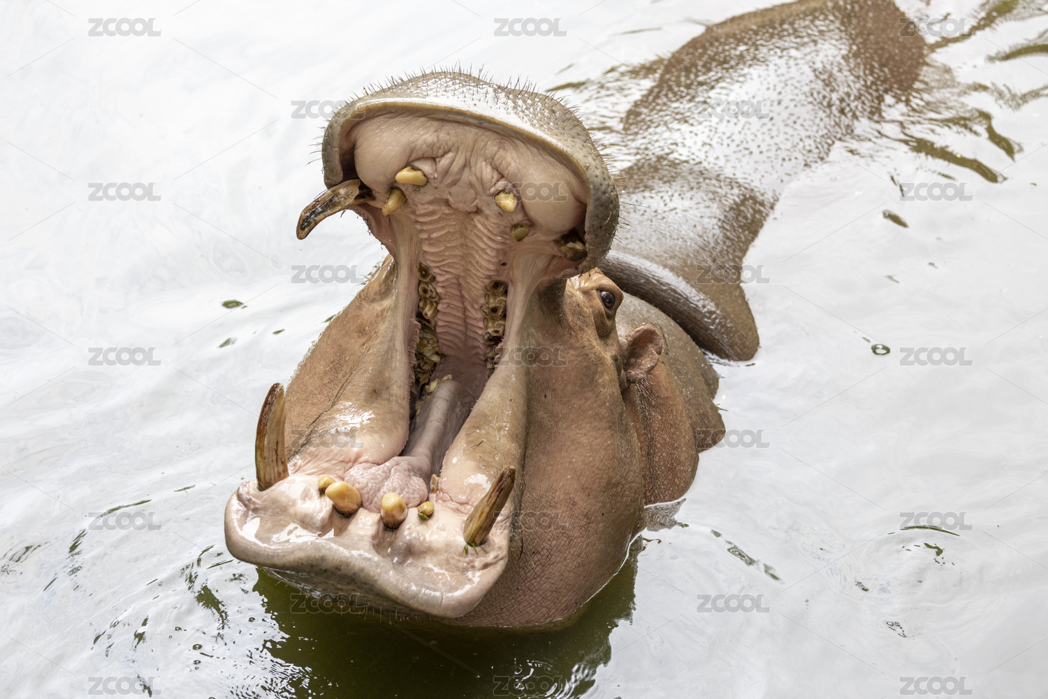 一只张开大嘴的河马在水中嬉戏玩耍