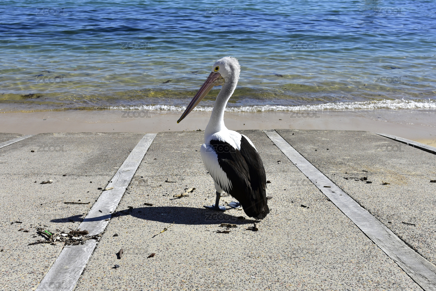澳大利亚悉尼海滩上栖息的大嘴鸟鹈鹕特写