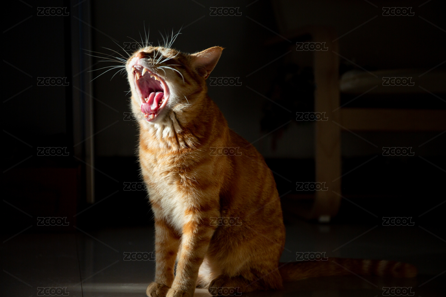 家里黑色背景下张大嘴打哈欠的橘猫