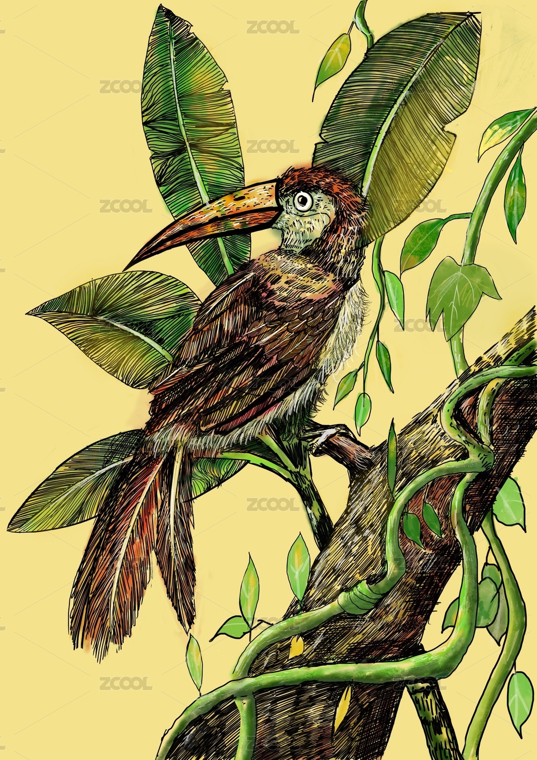 藤蔓芭蕉树与大嘴鸟