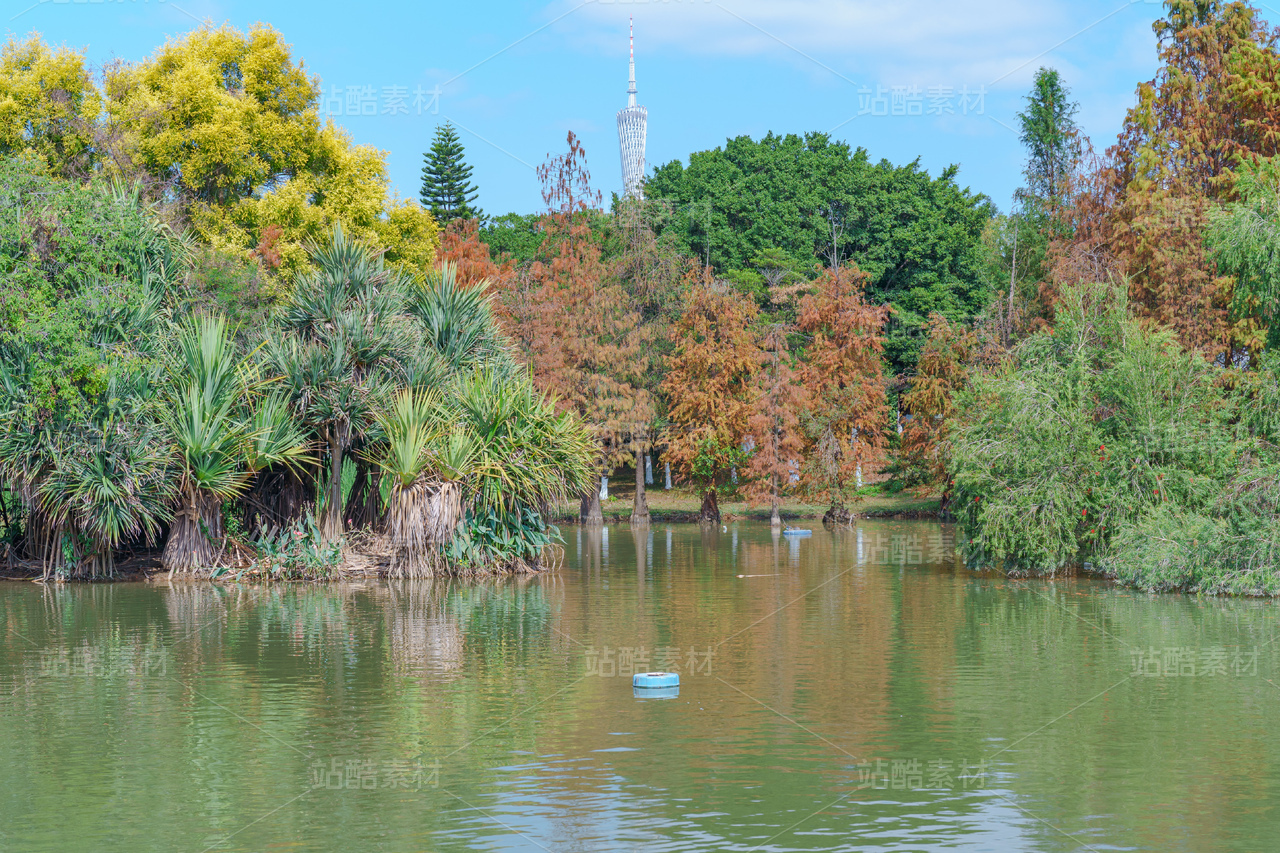 广州海珠湖公园湖边落羽杉树林与广州塔建筑