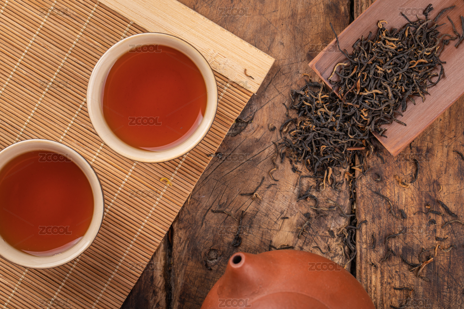 木制背景上的茶具与红茶茶叶