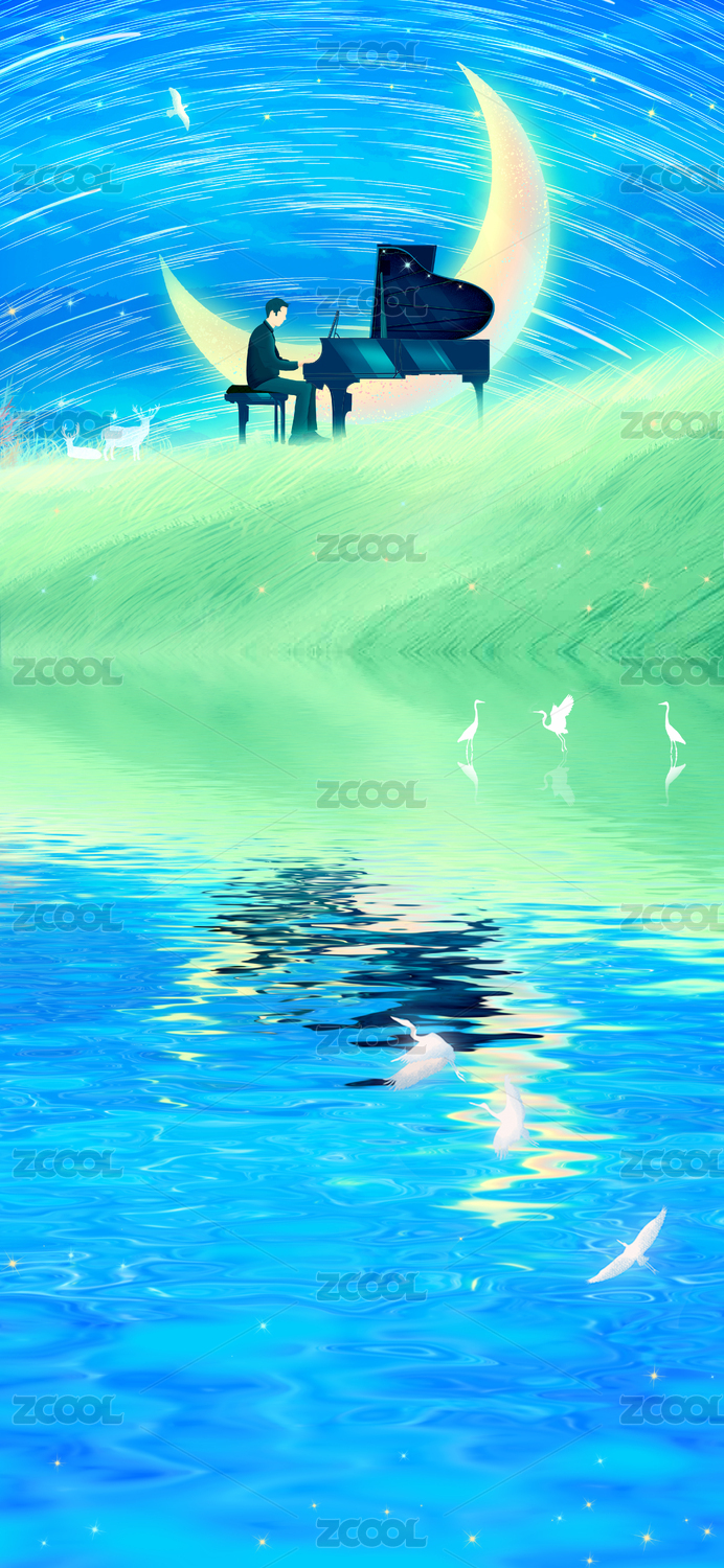 夏天的夜晚月亮躺在草坪上,一位音乐人在草坪前面弹奏钢琴插画背景海报
