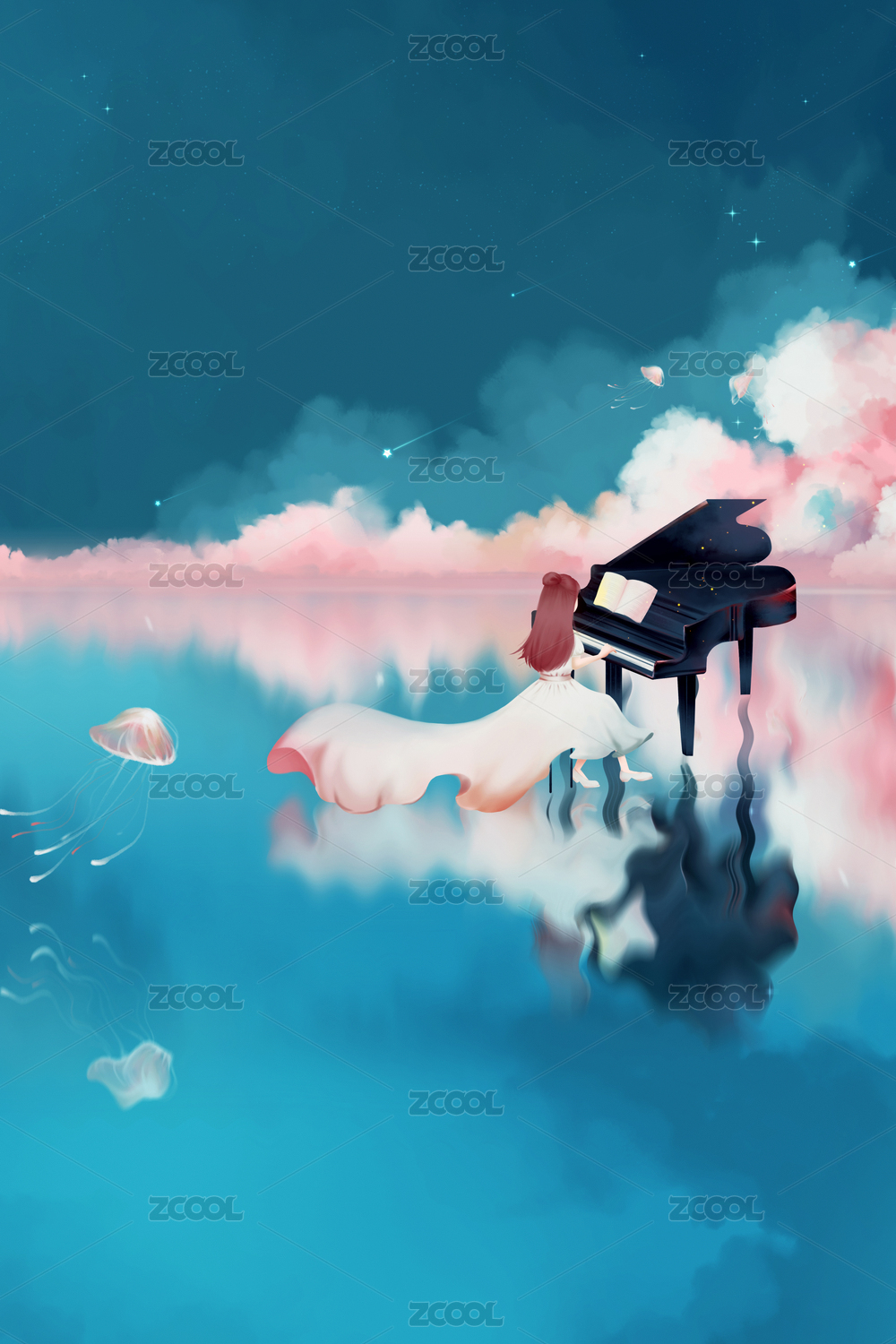 在梦幻的天空背景中在钢琴键上行走的人插画 数码绘画