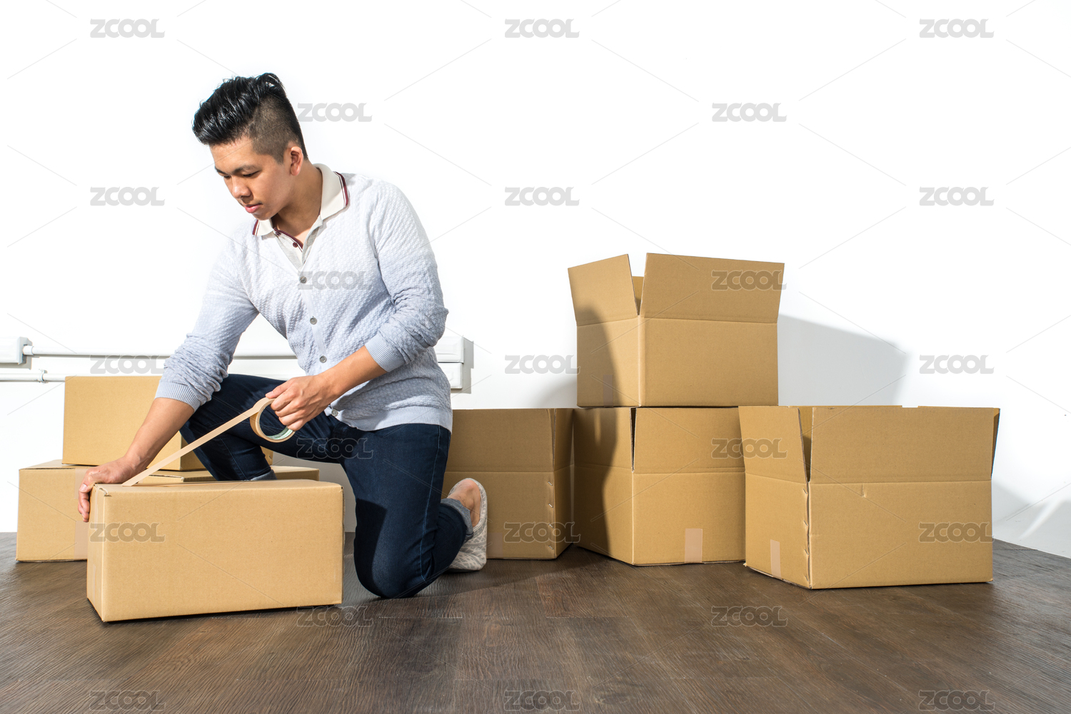 年轻的亚洲男子搬家使用粘合剂包装纸箱,搬迁