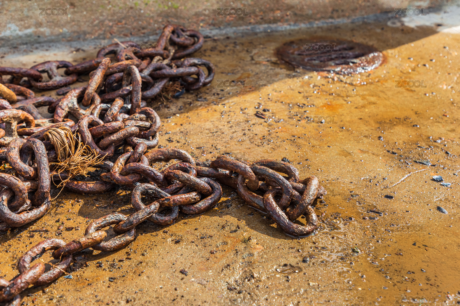 地上潮湿和铁锈的铁链条