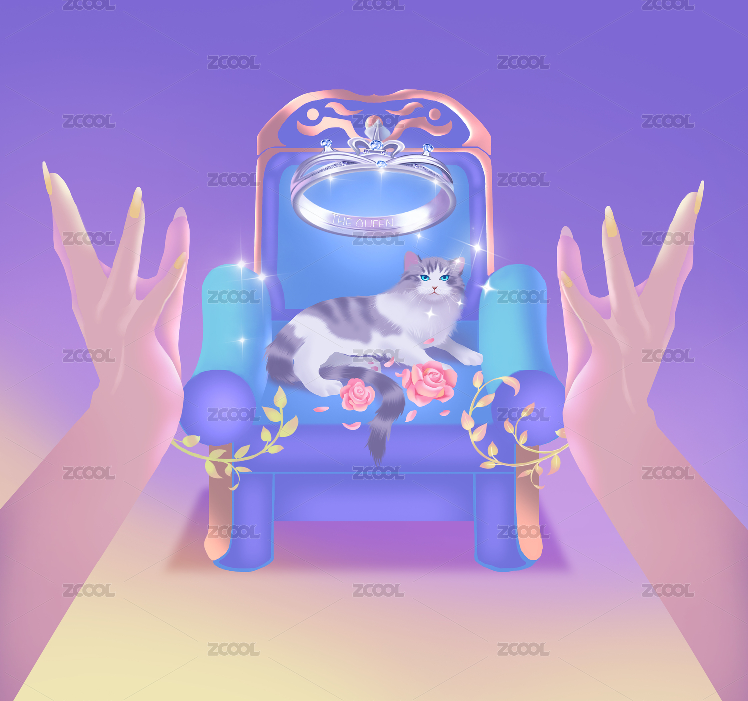 手捧王冠为坐在宝座上的猫加冕