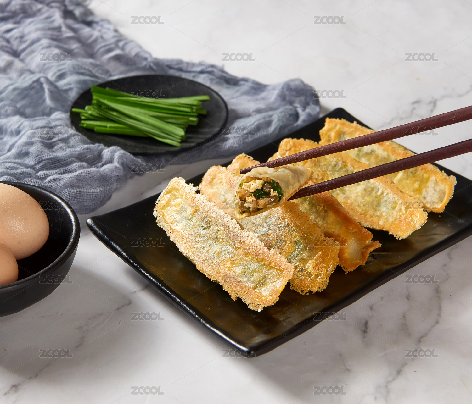 黑色盘子里金黄外皮的韭菜鸡蛋锅贴