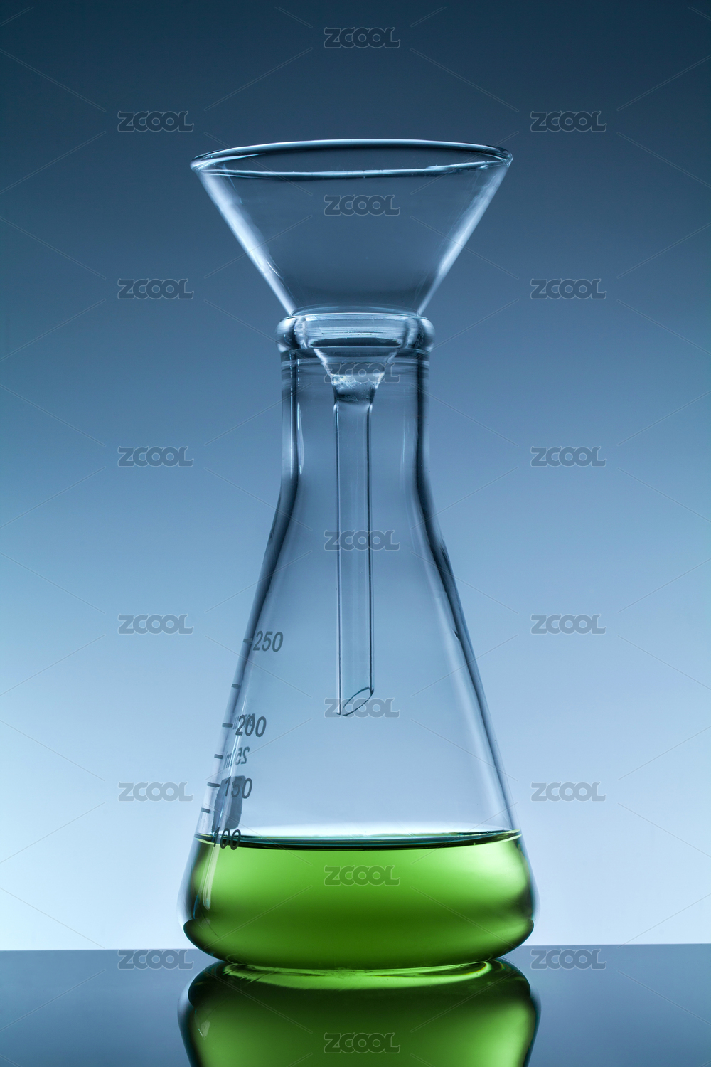 暗蓝色背景中装着绿色液体的锥形瓶和漏斗