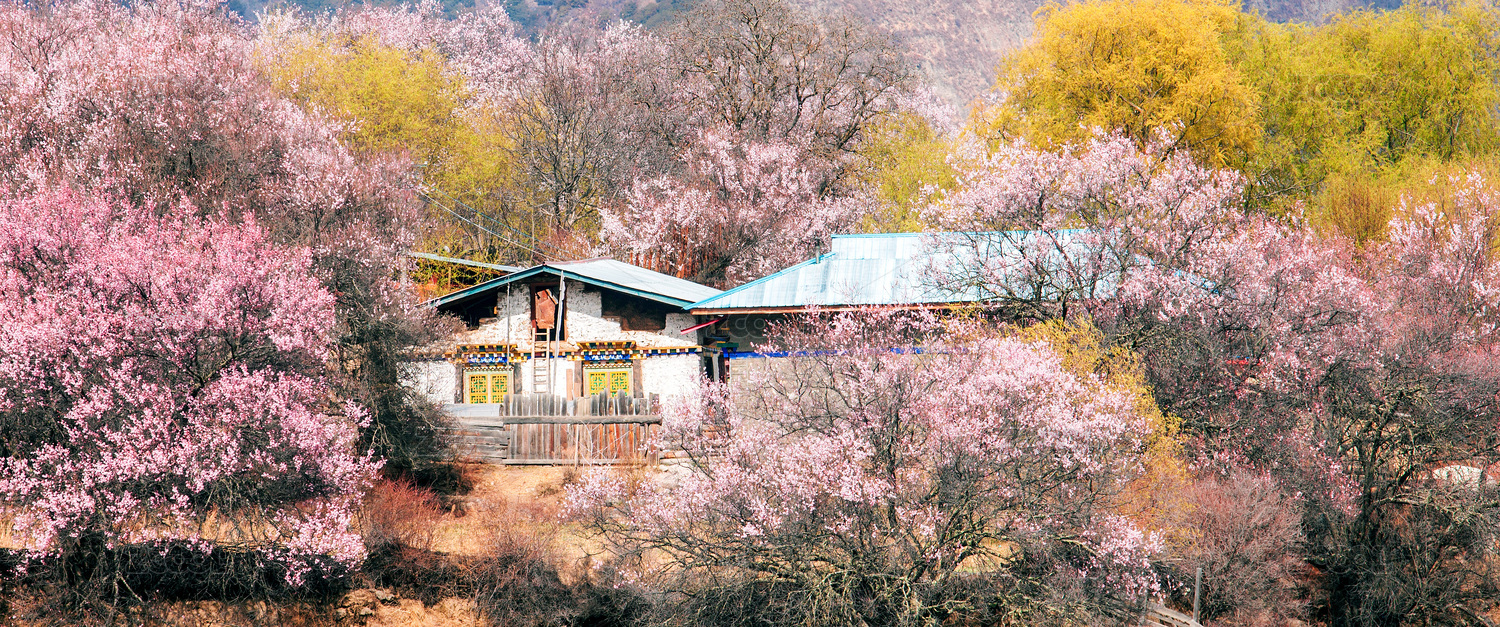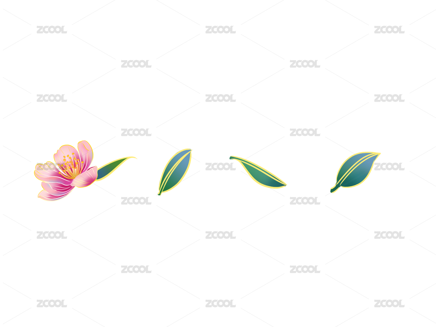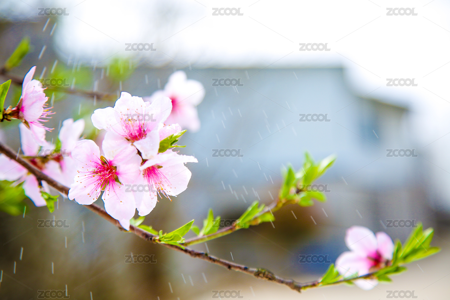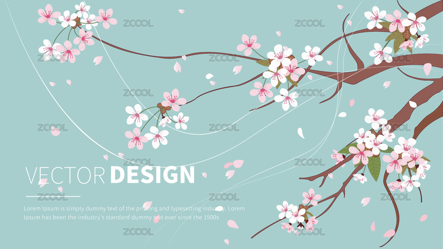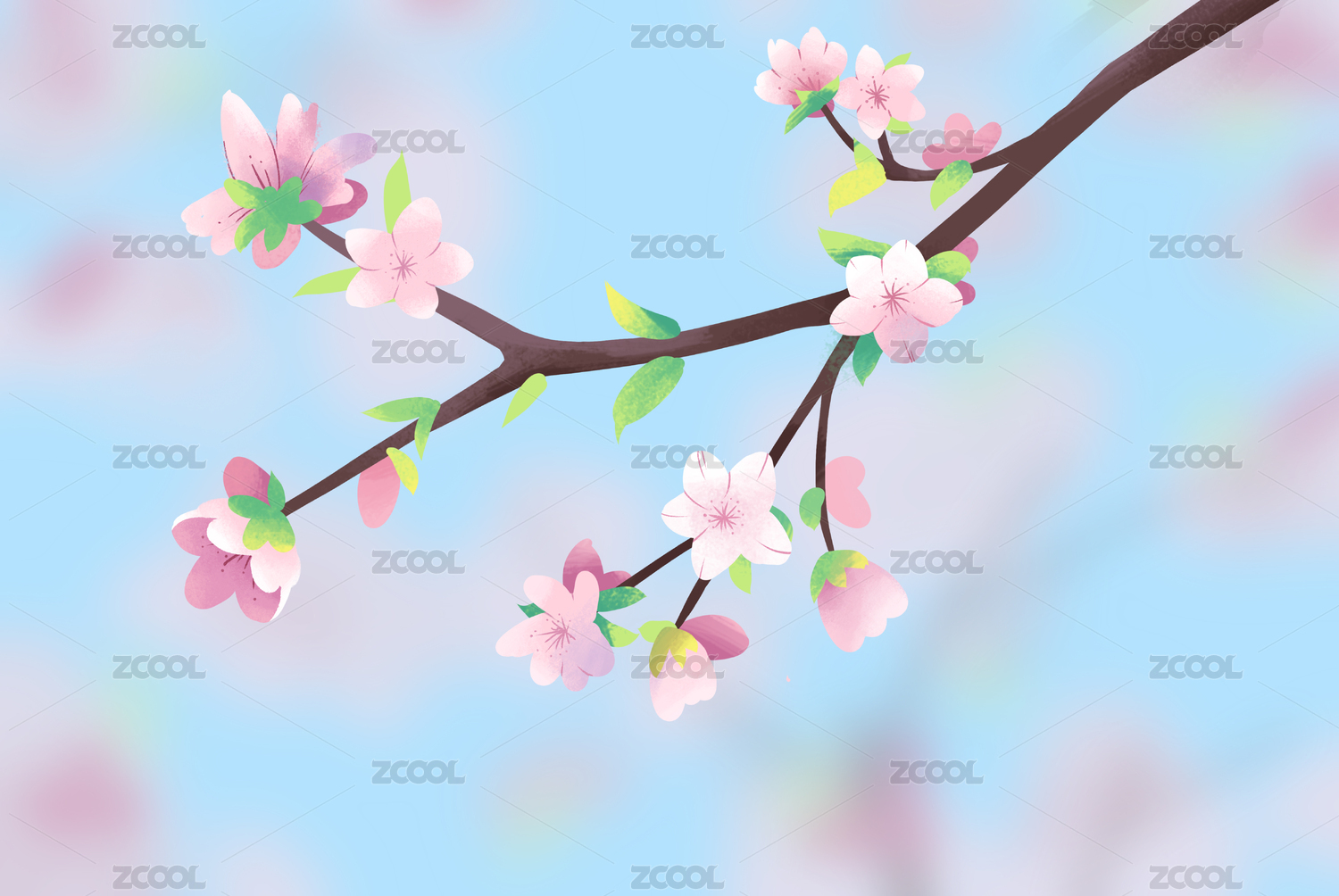 手绘一枝绽放的桃花 搭配蓝天白云背景