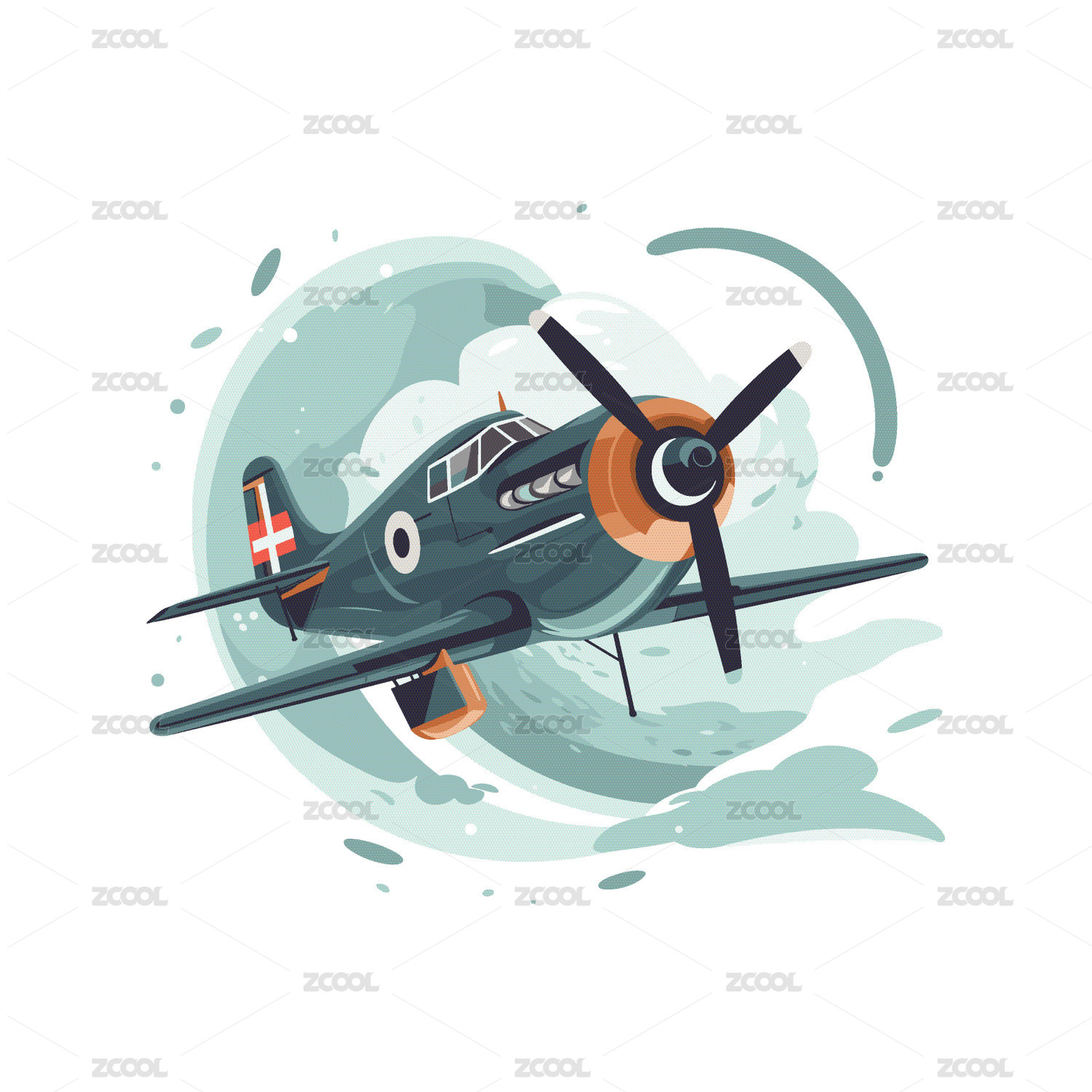 卡通老式战斗机在天空中飞行