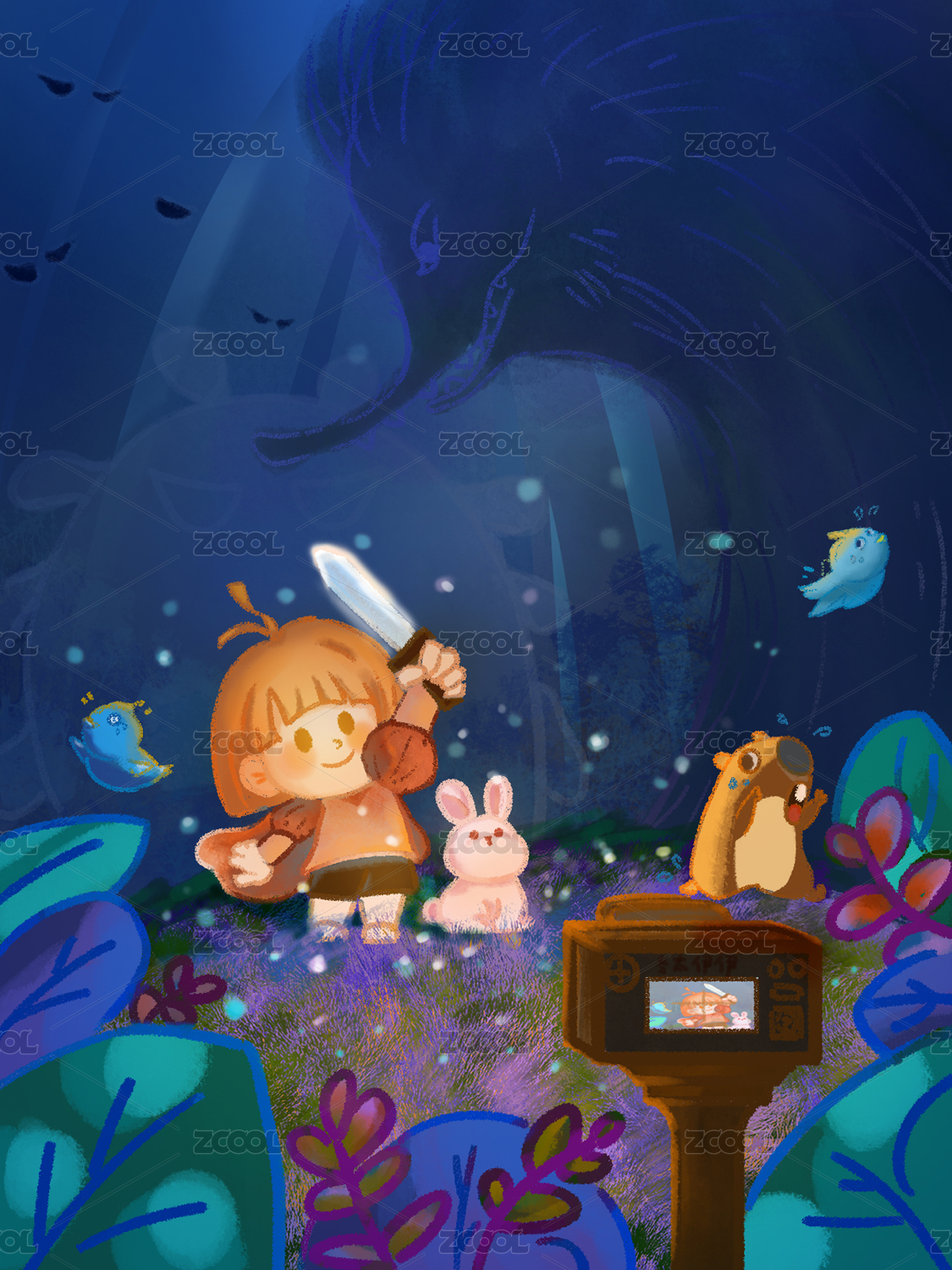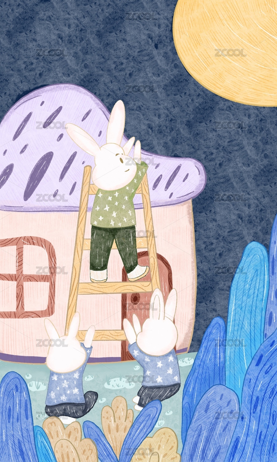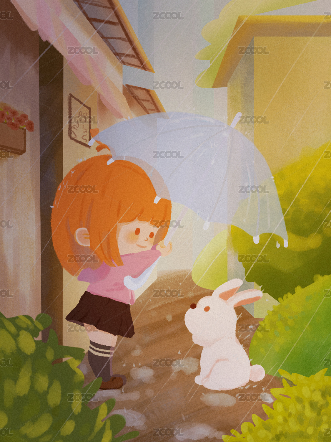 可爱卡通女孩与兔子雨中绘本风户外场景插画