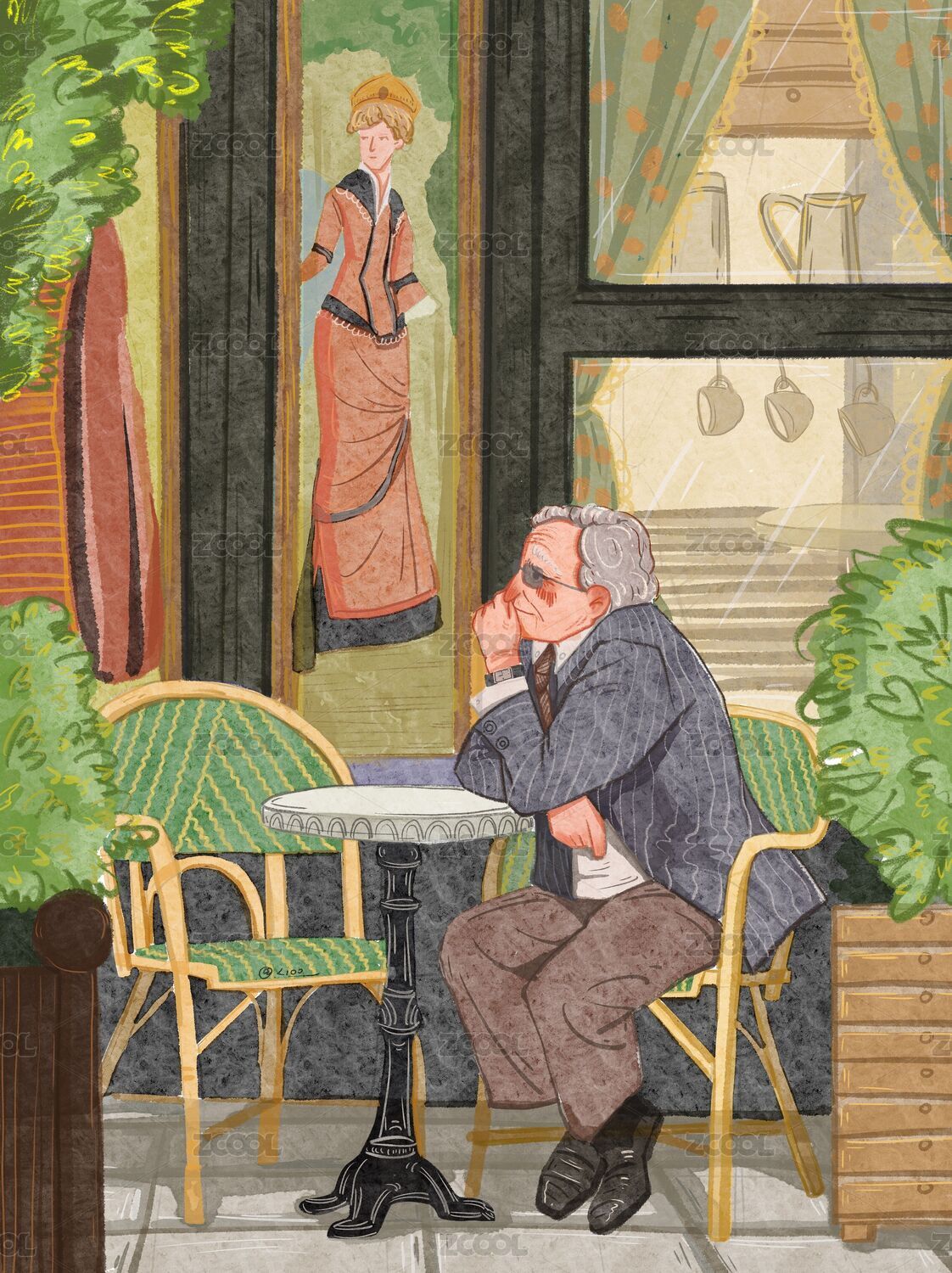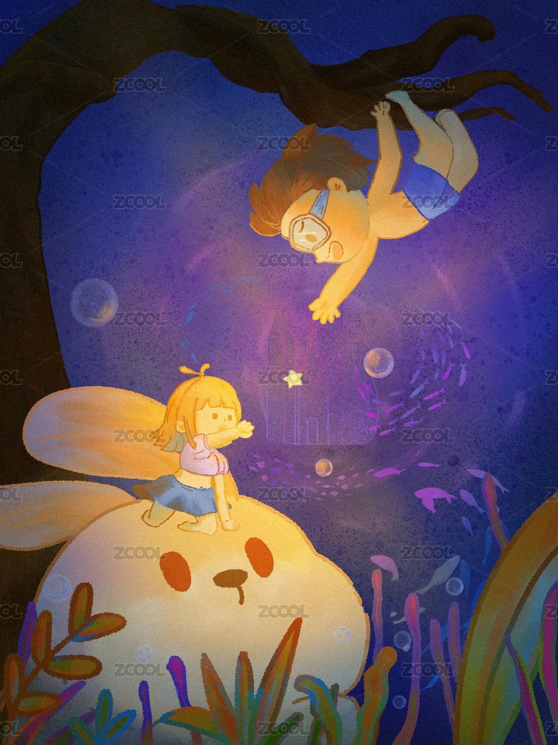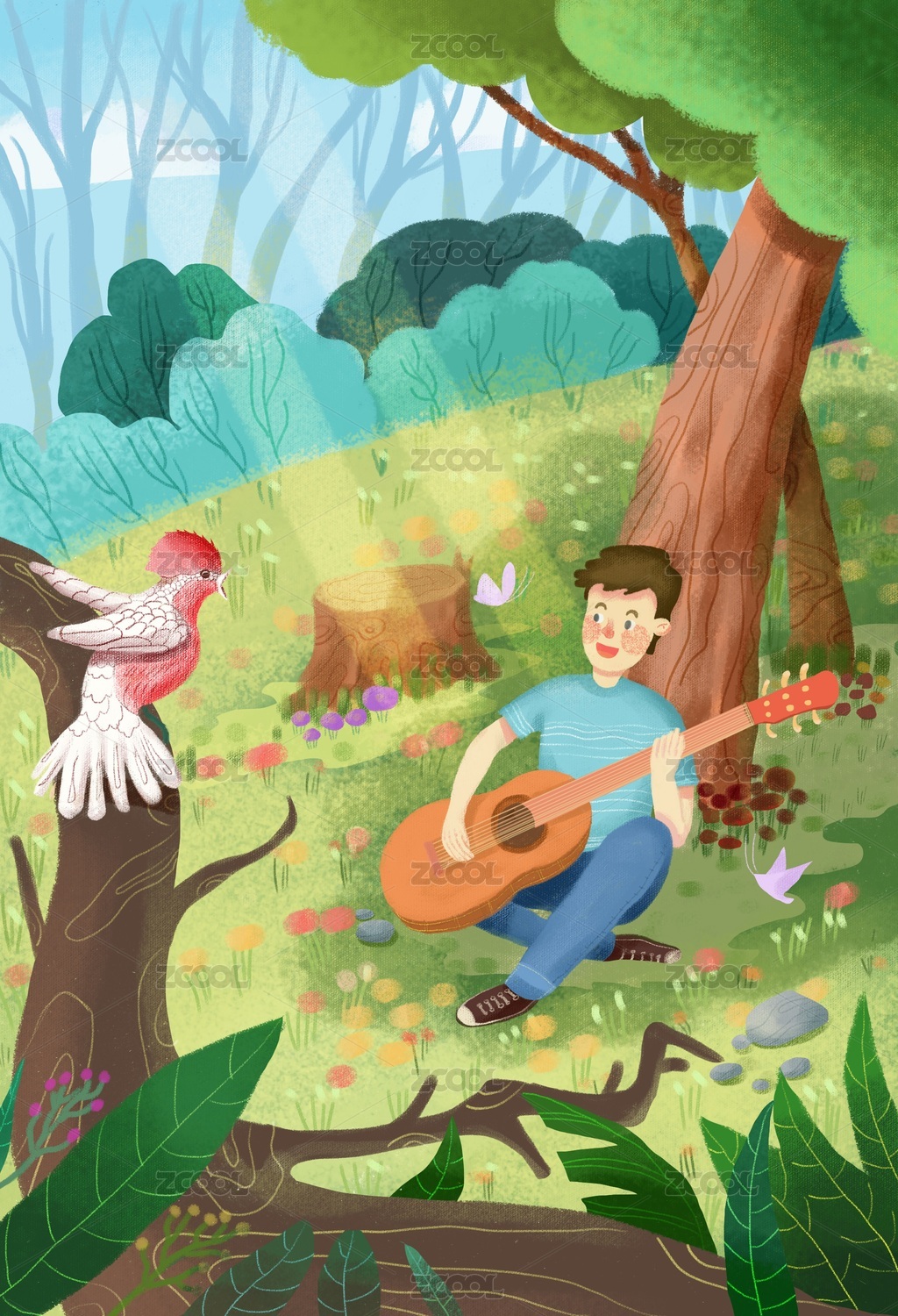 可爱卡通女孩与兔子雨中绘本风户外场景插画