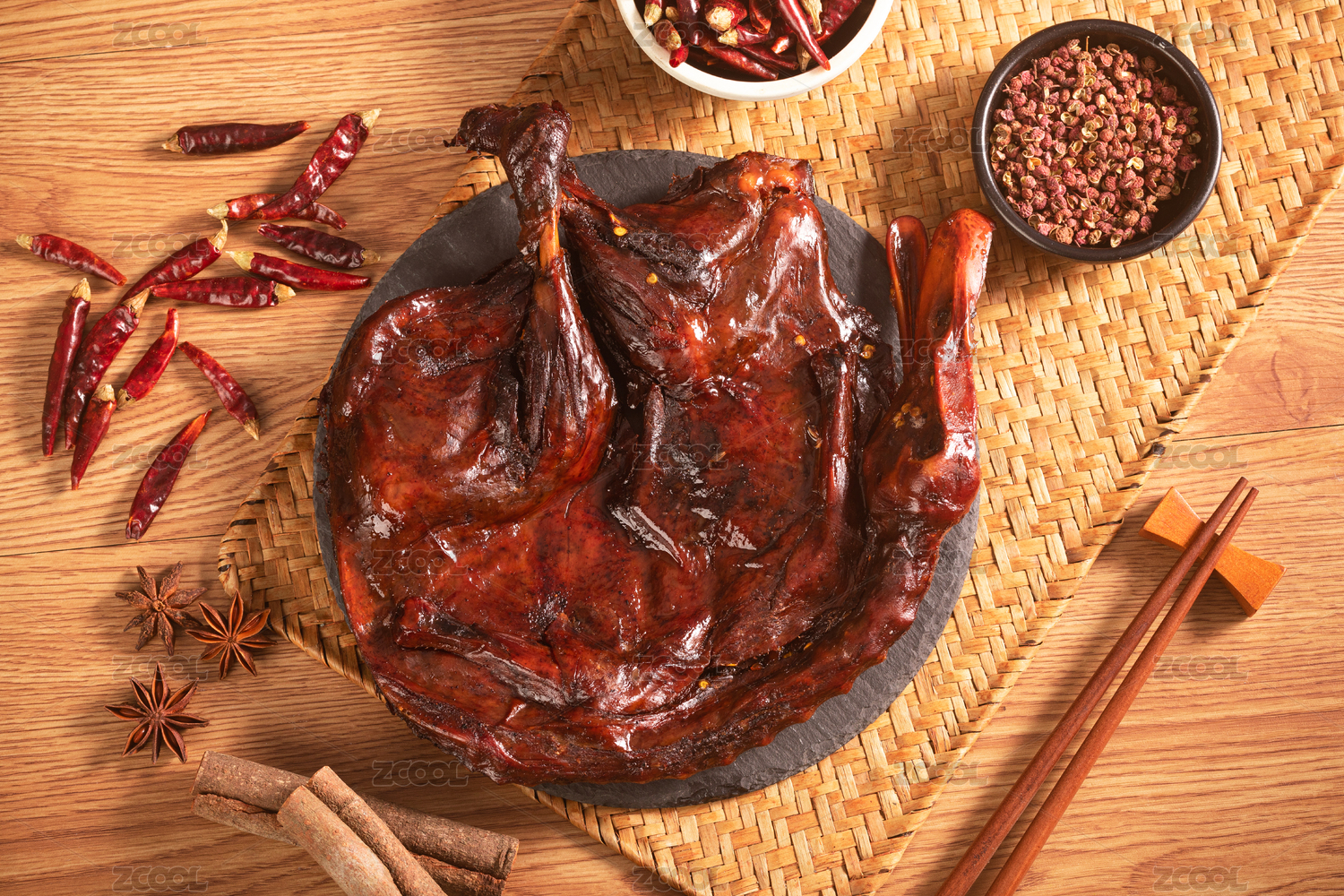 俯拍中式场景中装在黑色盘子中的完整酱板鸭